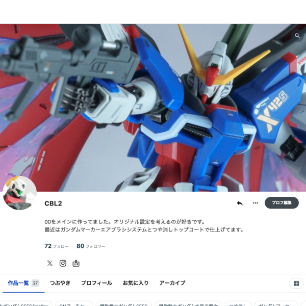 CBL2 CBL2さんのページ コピー https://gumpla.jp/author/emocamera facebook X LINE GUNSTAのロゴ等の使用 00をメインに作ってました。オリジナル設定を考えるのが好きです。 最近はガンダムマーカーエアブラシシステムとつや消しトップコートで仕上げてます。 73フォロー 90フォロワー 作品一覧29 つぶやき プロフィール お気に入り アーカイブ 4 ルナマリアに着せようかとも思ってました。 積みプラ多すぎて同… ルナマリアに着せようかとも思ってました。積みプラ多すぎて同時並行で30MSを作っていた頃がありました。当時より積みプラが増えています。実はこの子、1年くらいかかってるんですよねえ。ええ、完成しました。予約投稿にしたらプレビューや編集ができなくなっちゃったんですが、そういう仕様です? 画像が暗かったので調整し直したら、今度はトップ画像のミス(ウ… 画像が暗かったので調整し直したら、今度はトップ画像のミス(ウォーターマークが入ってた)があったので再度差し替え!! 1 ずっとヘッダー画像が登録できなくなってたと思ってたけど、もし… ずっとヘッダー画像が登録できなくなってたと思ってたけど、もしかしたら画像サイズに問題があったかもしれない。大きい画像でやったらあっさり登録できた。このでってにーとっても好き。かっこいい!昨日投稿した写真が暗かったので再調整して差し替えました。 1 シンの機体ズ。 写真は撮り終えているのでそのうち投稿します〜… シンの機体ズ。写真は撮り終えているのでそのうち投稿します〜! 1 ルドラとバクゥのバックパック、無改造で交換できることに気づい… ルドラとバクゥのバックパック、無改造で交換できることに気づいた…!! 1 X09Aを作りちゅう。 インディー上松さんのイミテーションイ… X09Aを作りちゅう。インディー上松さんのイミテーションインフィニットジャスティスを参考にさせていただいてます。まだまだ手を加える予定、今30%って感じ。 1 次はデスティニー作ろうかな(?) 次はデスティニー作ろうかな(?) 1 レジェンド(残骸) レジェンド(残骸) 1 M1作ってる M1作ってる 1 できたできた!!イージス!!キットがすでにかっこよいし作って… できたできた!!イージス!!キットがすでにかっこよいし作ってて楽しかったのであんまり手を加えないようにした!! 2 シンのアクスタ届いたので早速OP再現!! 君のresista… シンのアクスタ届いたので早速OP再現!! 君のresistance 僕とのdistance〜 1 できたできた!ザウォート!S字立ちにこだわって干渉するリアア… できたできた!ザウォート!S字立ちにこだわって干渉するリアアーマーをちょっといじった。ティックバランと一緒に撮影しましょ。 1 イモータルジャスティスでちょっと燃え尽きた感あるので、肩の力… イモータルジャスティスでちょっと燃え尽きた感あるので、肩の力を抜いて… 1 100円ショップのミニチュアでスタンドを考え中 100円ショップのミニチュアでスタンドを考え中 2 できたできた!!イモータルジャスティス!! あとはスタンドと… できたできた!!イモータルジャスティス!! あとはスタンドと握り手を用意したい。 リフター分離はどうしてもやりたくてな… 1 できたできた!ビルドストライクエクシードギャラクシー! アレ… できたできた!ビルドストライクエクシードギャラクシー! アレンジしたので機体名を考えたいなー