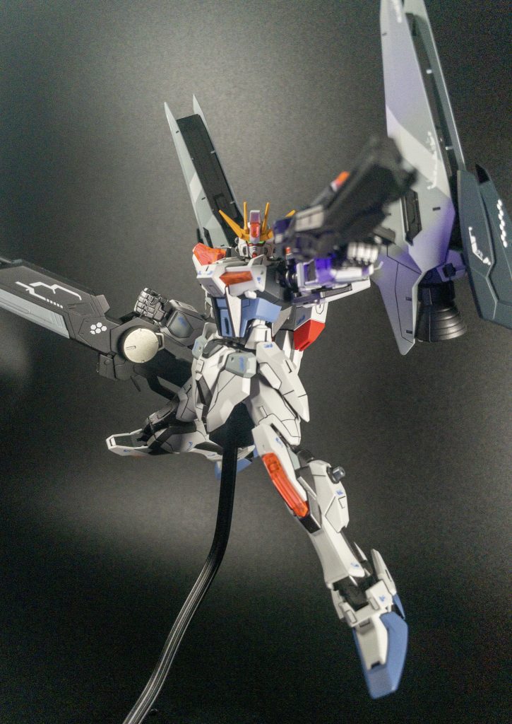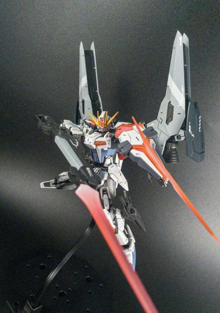 ビルドストライク本体は股関節部分をHG関節と入れ替え、肩アーマーはプラ材でストッパーを制作。他はスジ彫り等でディテールアップし、ヤスリがけは800番で仕上げました。全塗装しつつ最近ハマっているガイアカラーの半光沢で塗装しています。