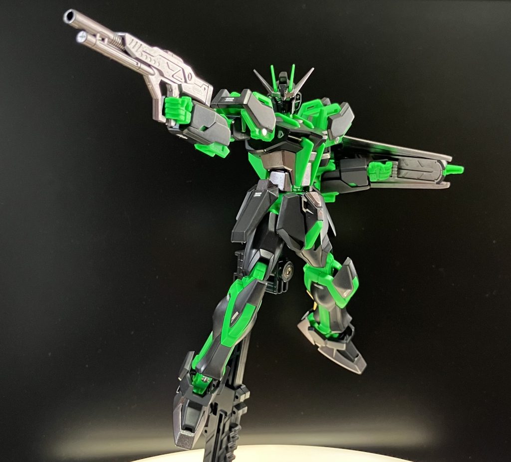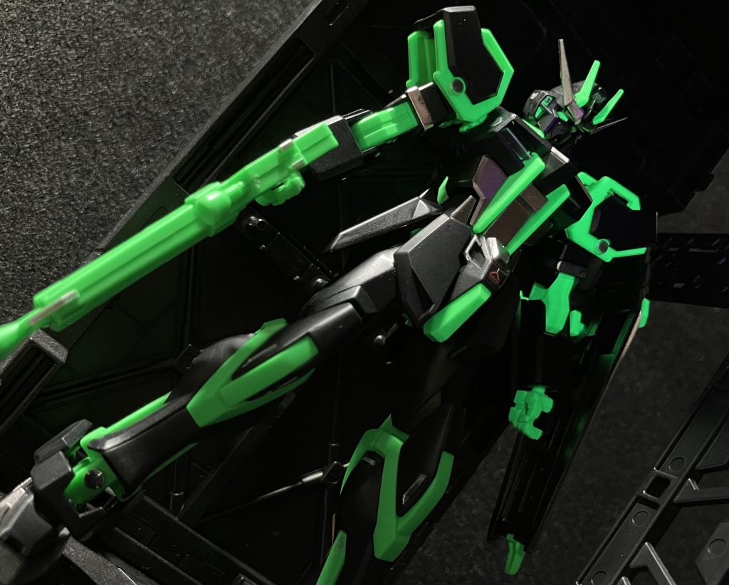 成形色のブラックとネオングリーンだけだと寂しかったので、アンテナ、シールド、腹部、足先をヘビーガンメタリックで部分塗装しましたが、良い感じになったと思います。