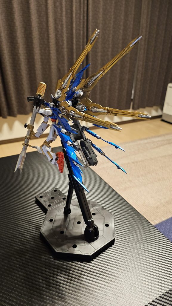 大きいマニューバはパールゴールド、小さい方はブルーのキャンディ塗装にて作成。本体は部分塗装でゴールドを塗ってます。