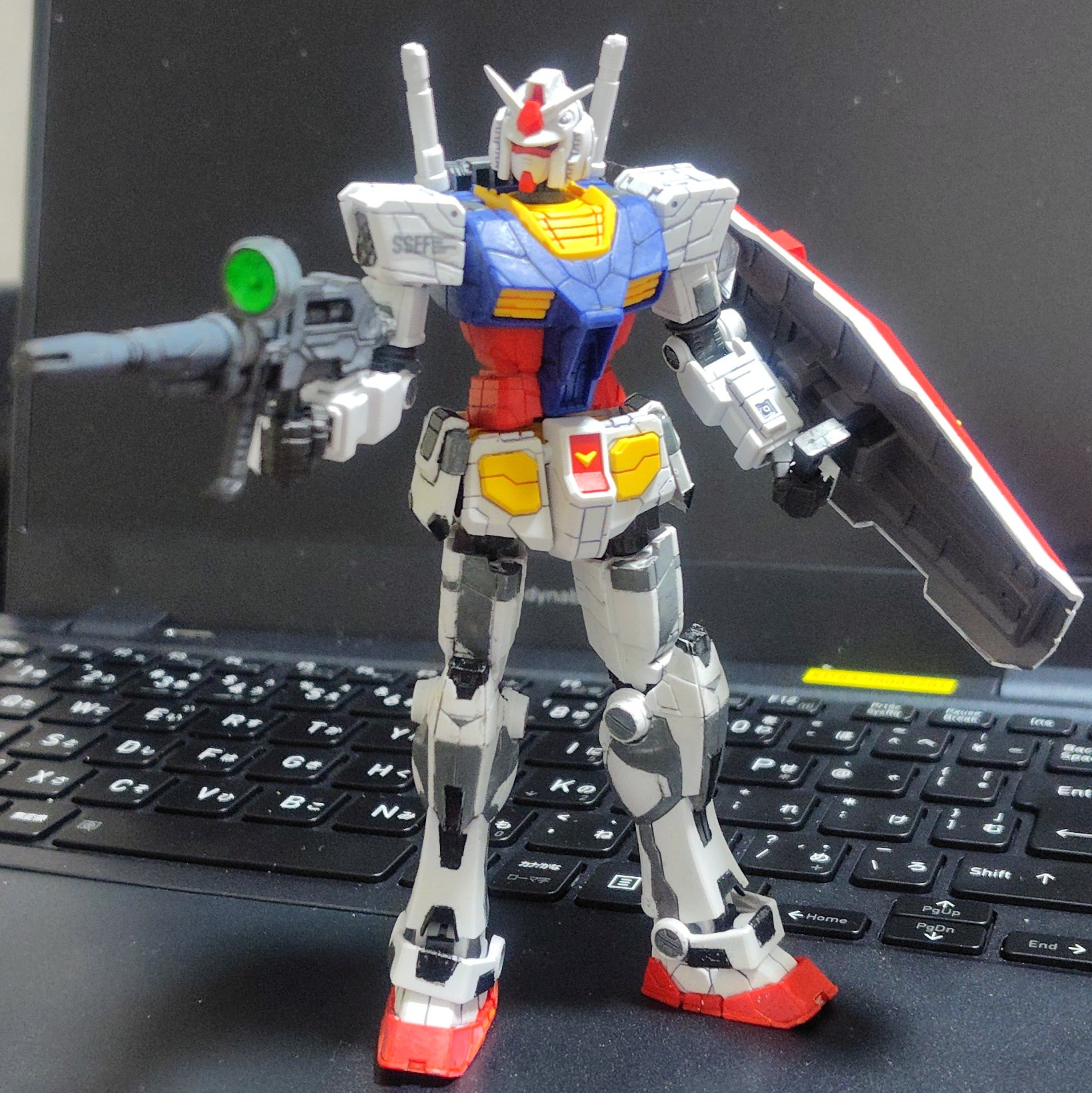 やっと完成しました。設定資料に基づいた塗装と股関節の破損でかなりの時間がかかってしまいました。サクッとできるEGなのに、でも手を掛けた甲斐があって、RG並みの色分けになりました。