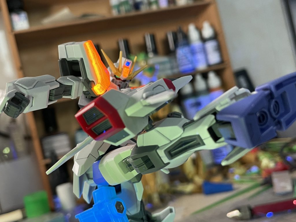 RGシステムを応用したエネルギー超光循環機構「EG(Energy Glitter-circulation)システム」が採用され、機体の各所にエネルギーを集中させ、攻撃・防御・機動時など状況に合わせたブーストアップが行えるようになり、ガンプラバトルでの総合性能値が低く設定されているEGのデメリットを微塵も感じさせない力を発揮する。