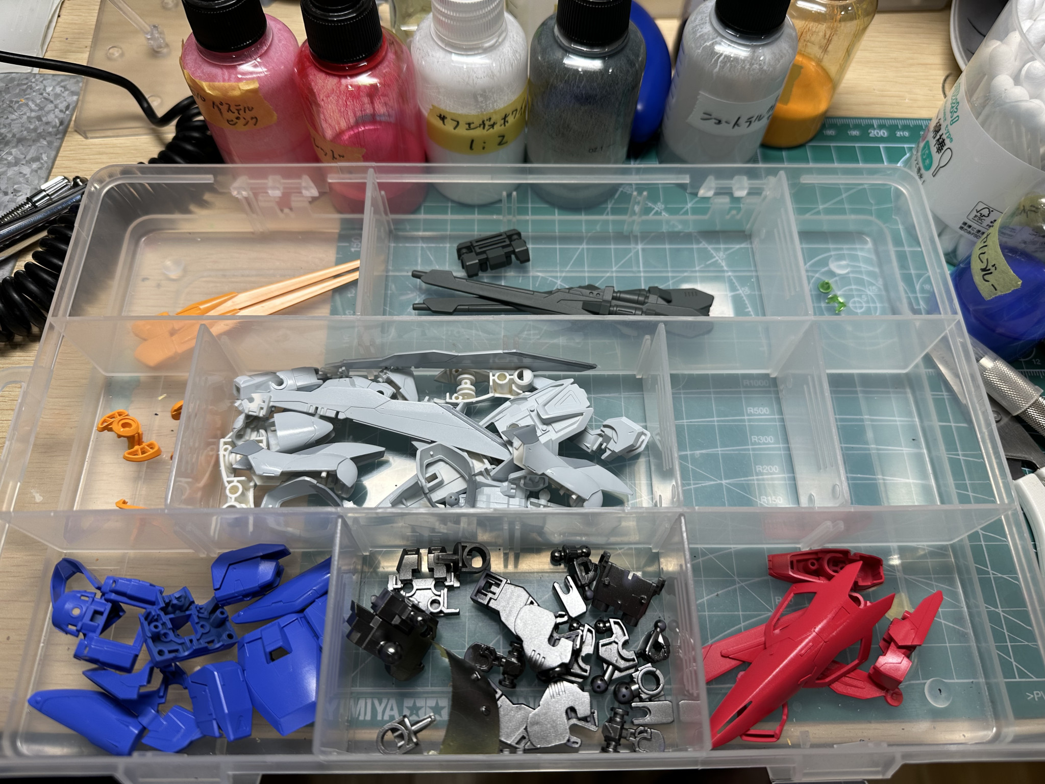 1日目の夜。ディテール工作中。アンクルガードの分割に時間がかかる。なるべくプラ板を貼る工作でスピードアップ。