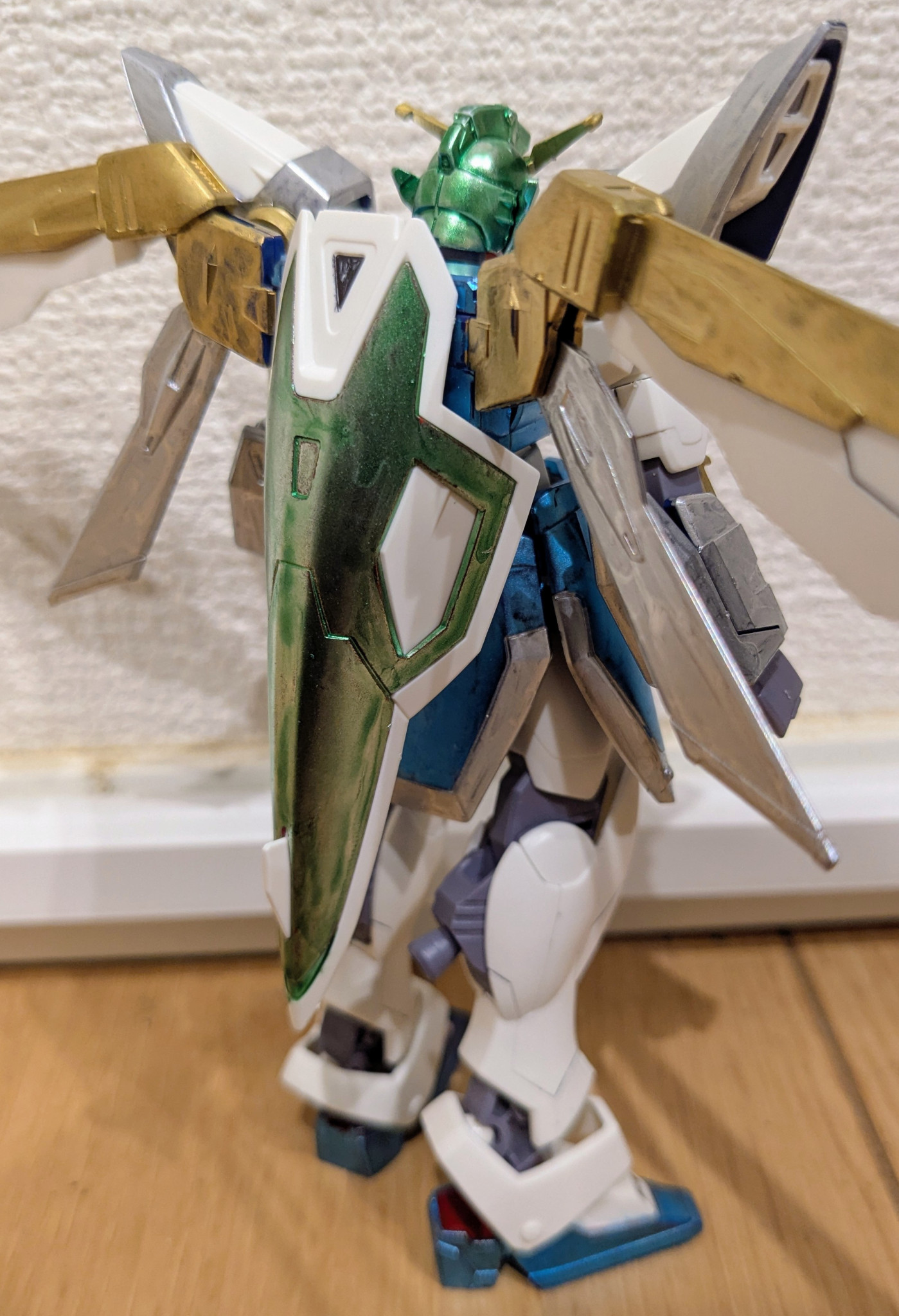 アンテナは中央部含め、リボンをイメージしてゴールド。頭はフェイス以外を、髪をイメージしてメタリックイエローグリーン。シールドはバックパックに下向きに接続し、赤だった部分をメタリックイエローグリーンに塗装し、大妖精のおさげイメージにしてみました。