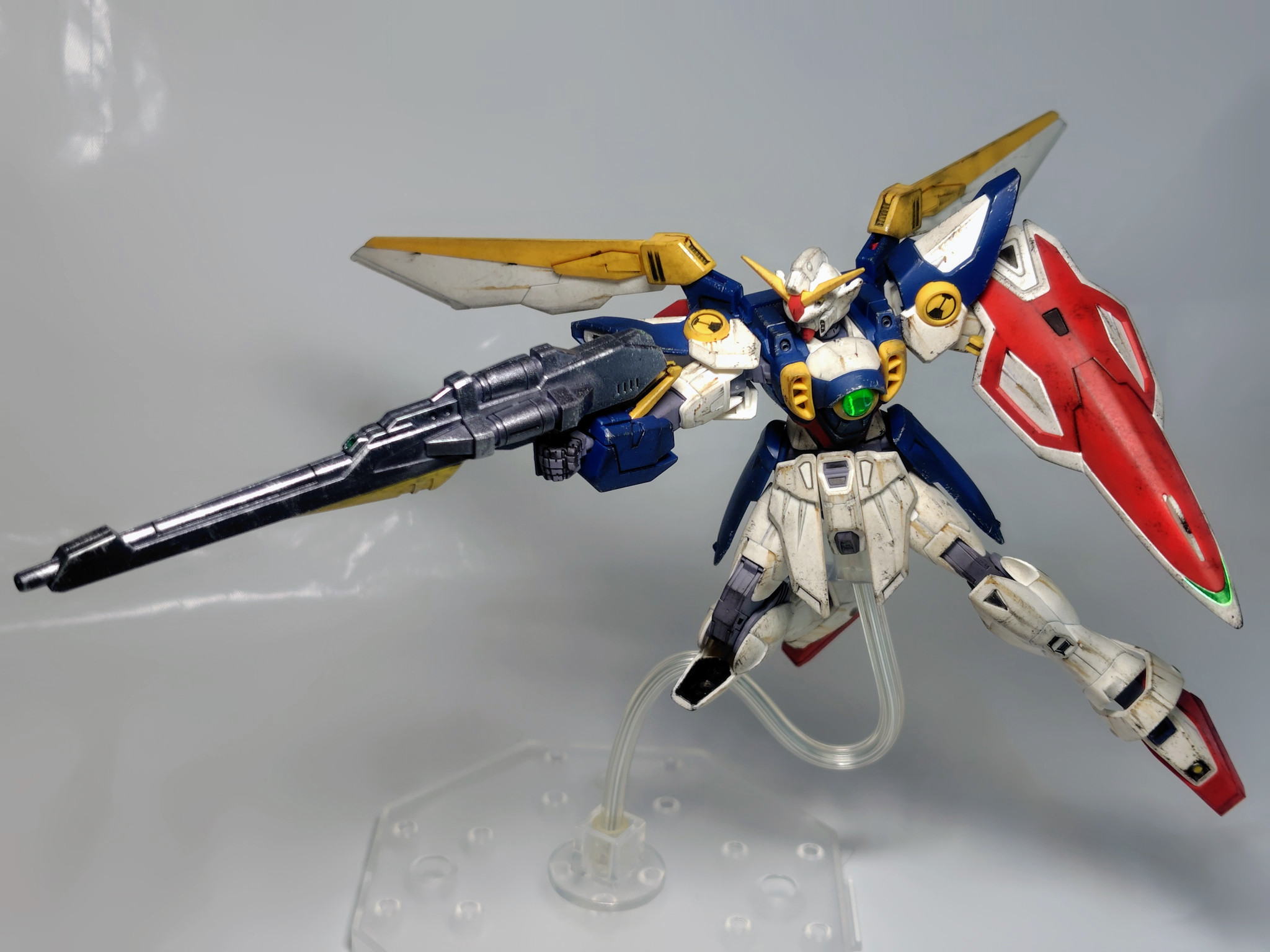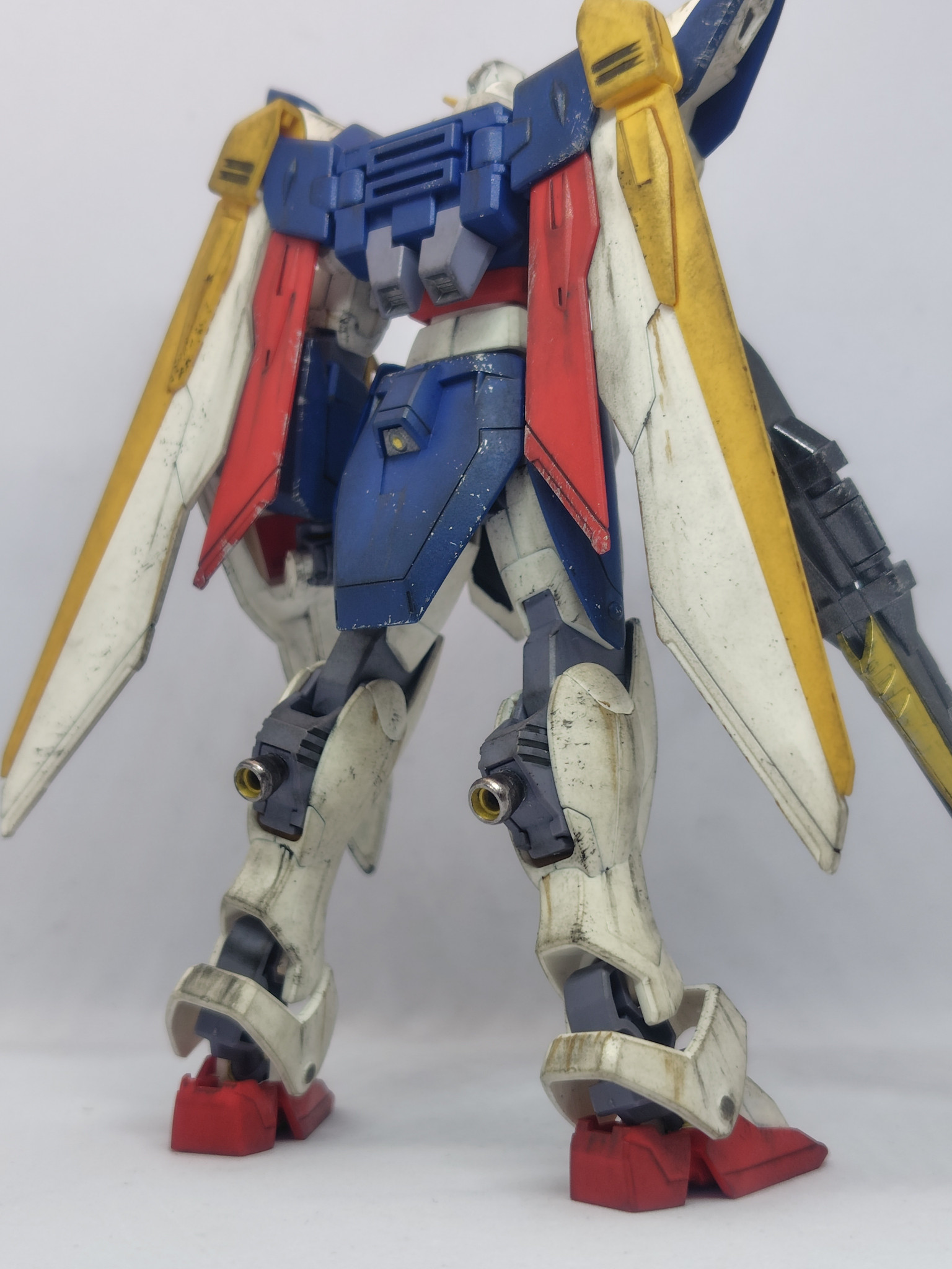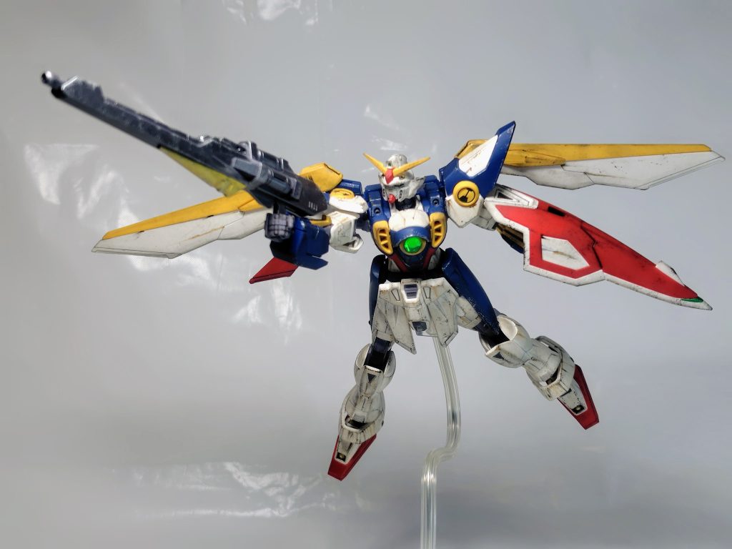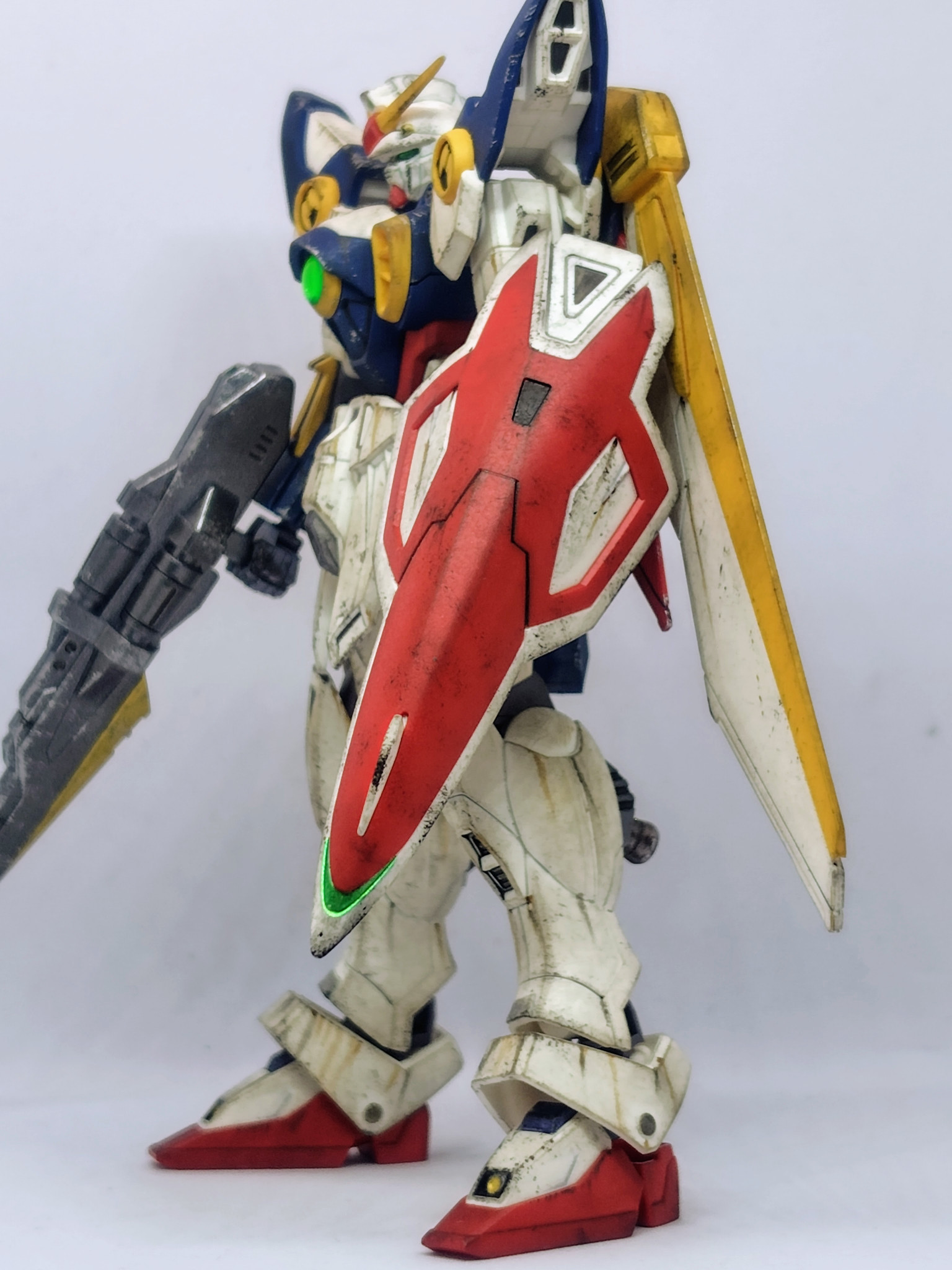 エントリーグレード ウイングガンダムのレビューです。キレイ目に作ろうかとも思ったのですが、劇中での扱われ方からするとやはり汚すべきと思い、強めのウェザリング仕上げにしました(gundam-kao6)