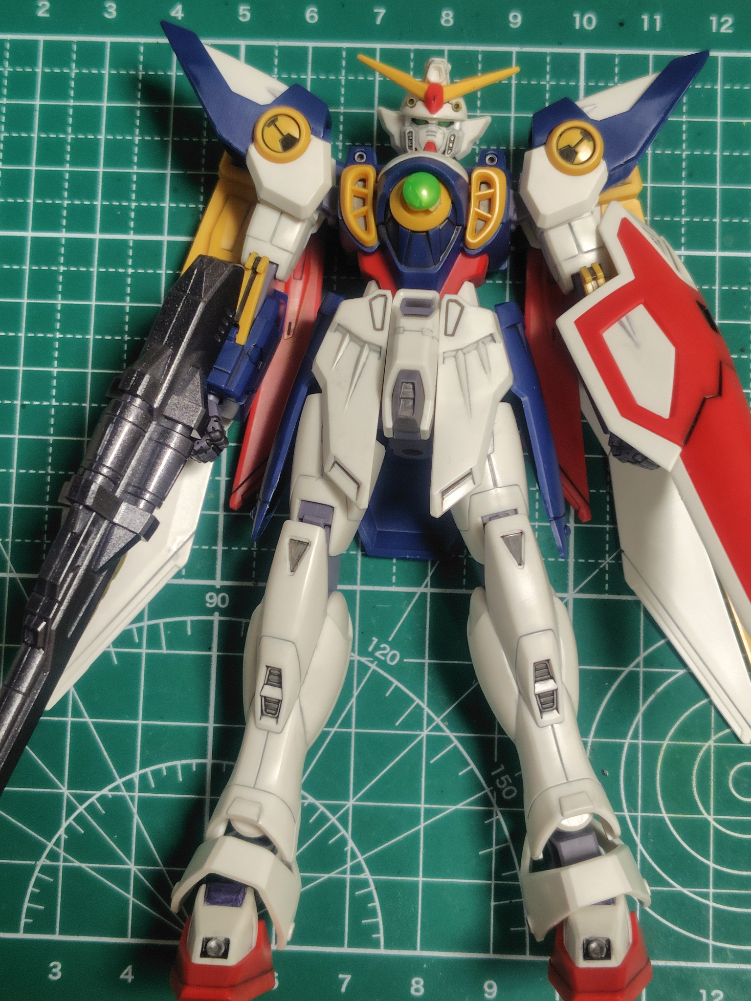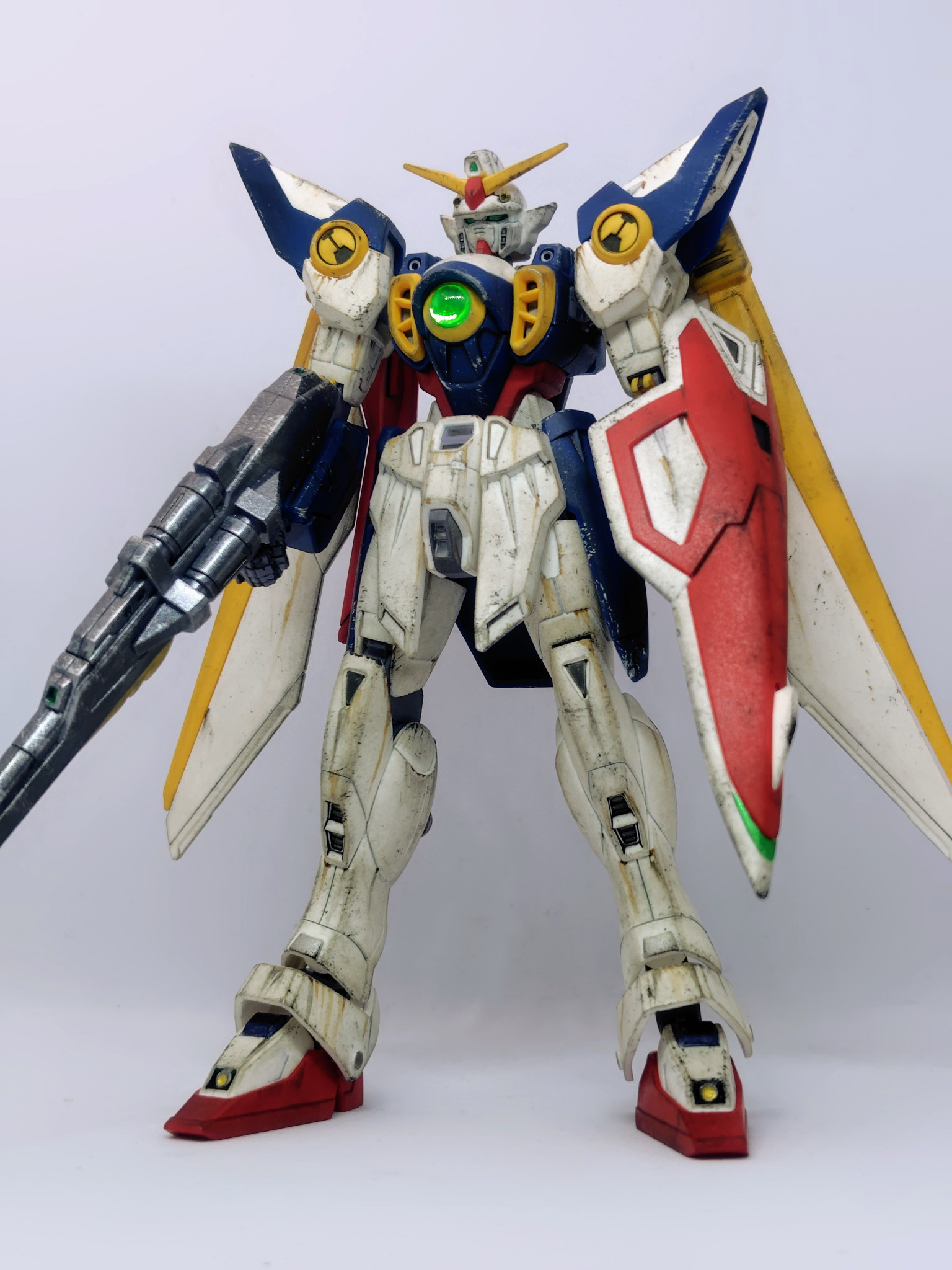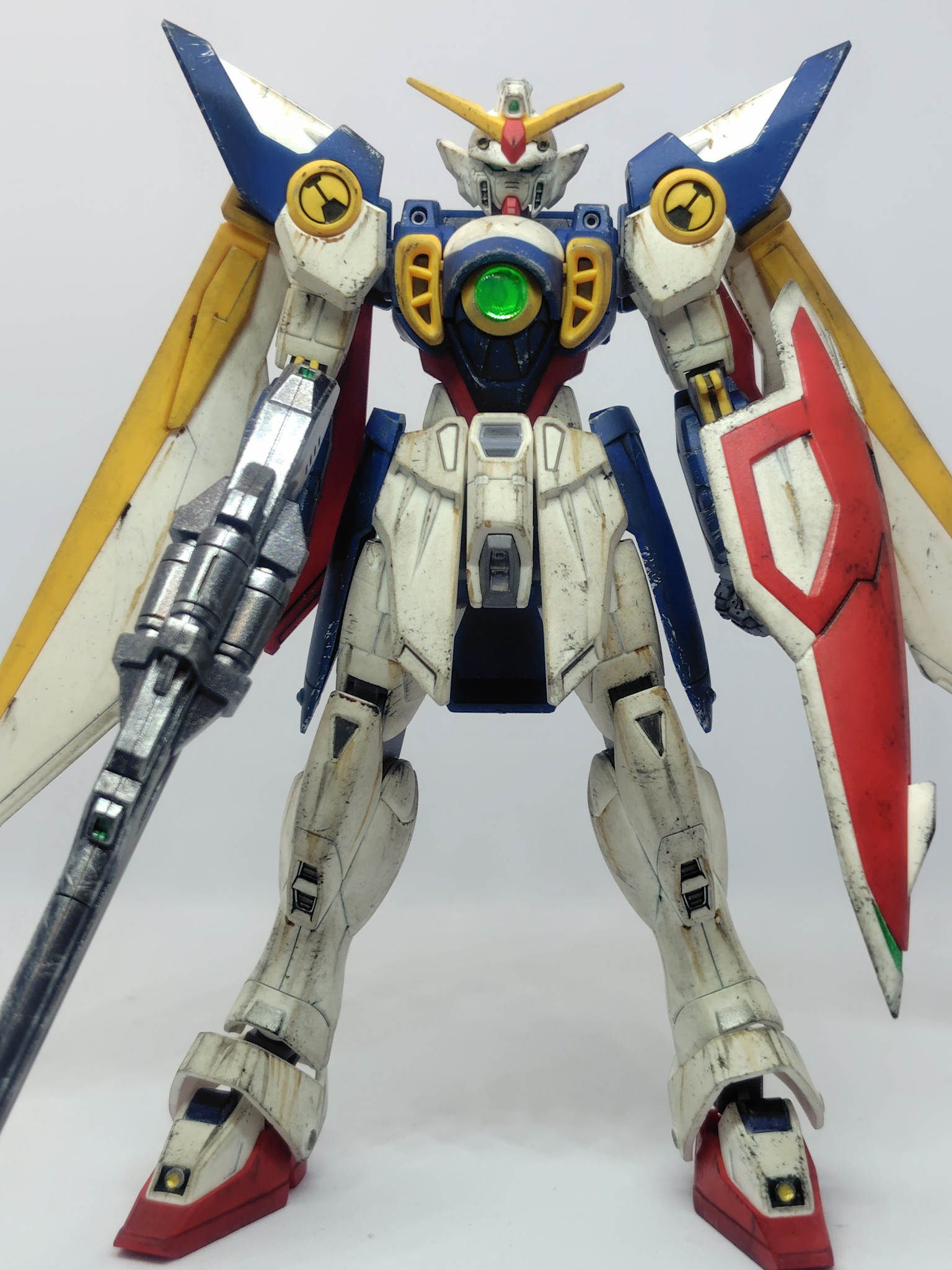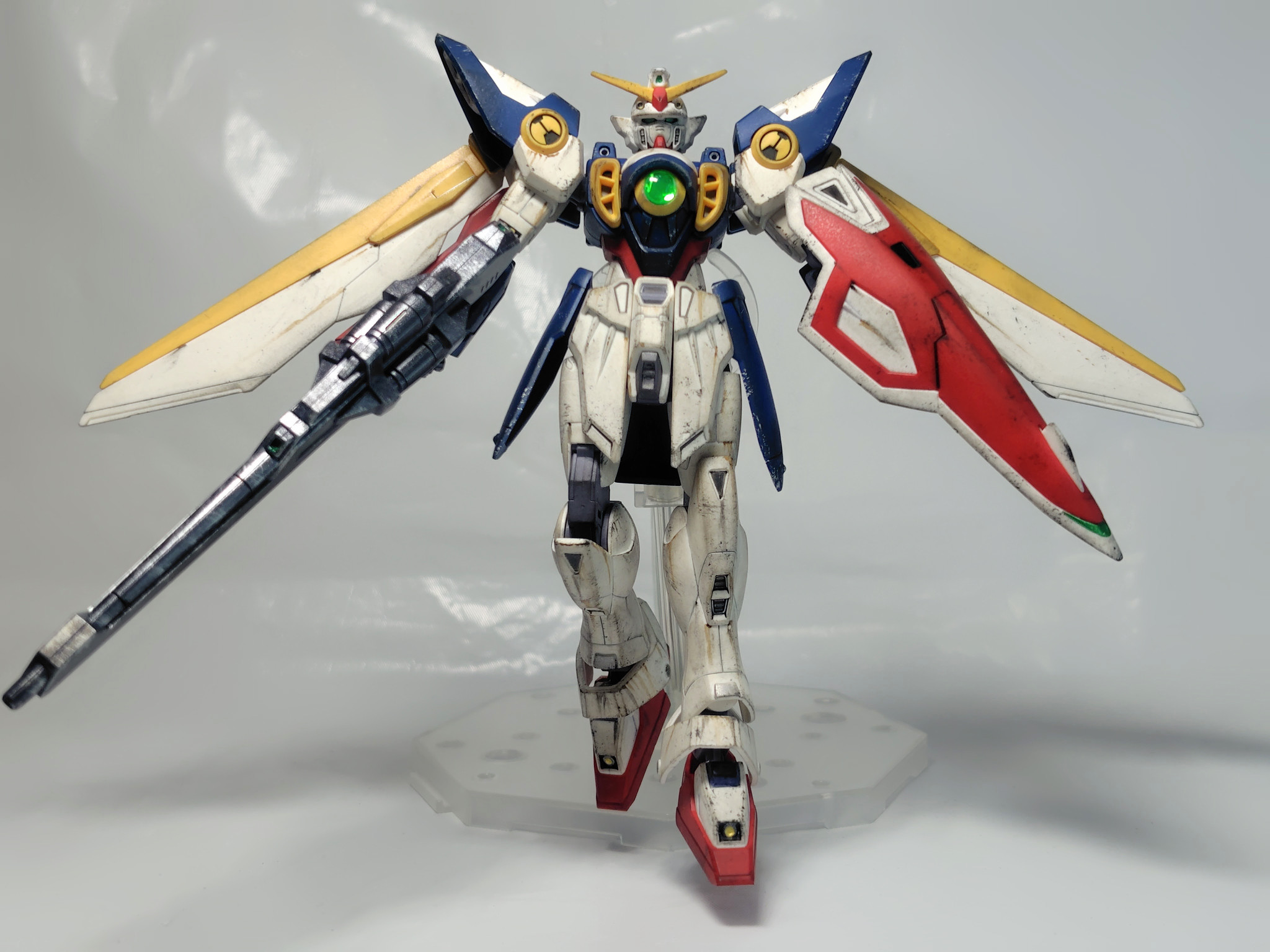エントリーグレード ウイングガンダムのレビューです。キレイ目に作ろうかとも思ったのですが、劇中での扱われ方からするとやはり汚すべきと思い、強めのウェザリング仕上げにしました(gundam-kao6)