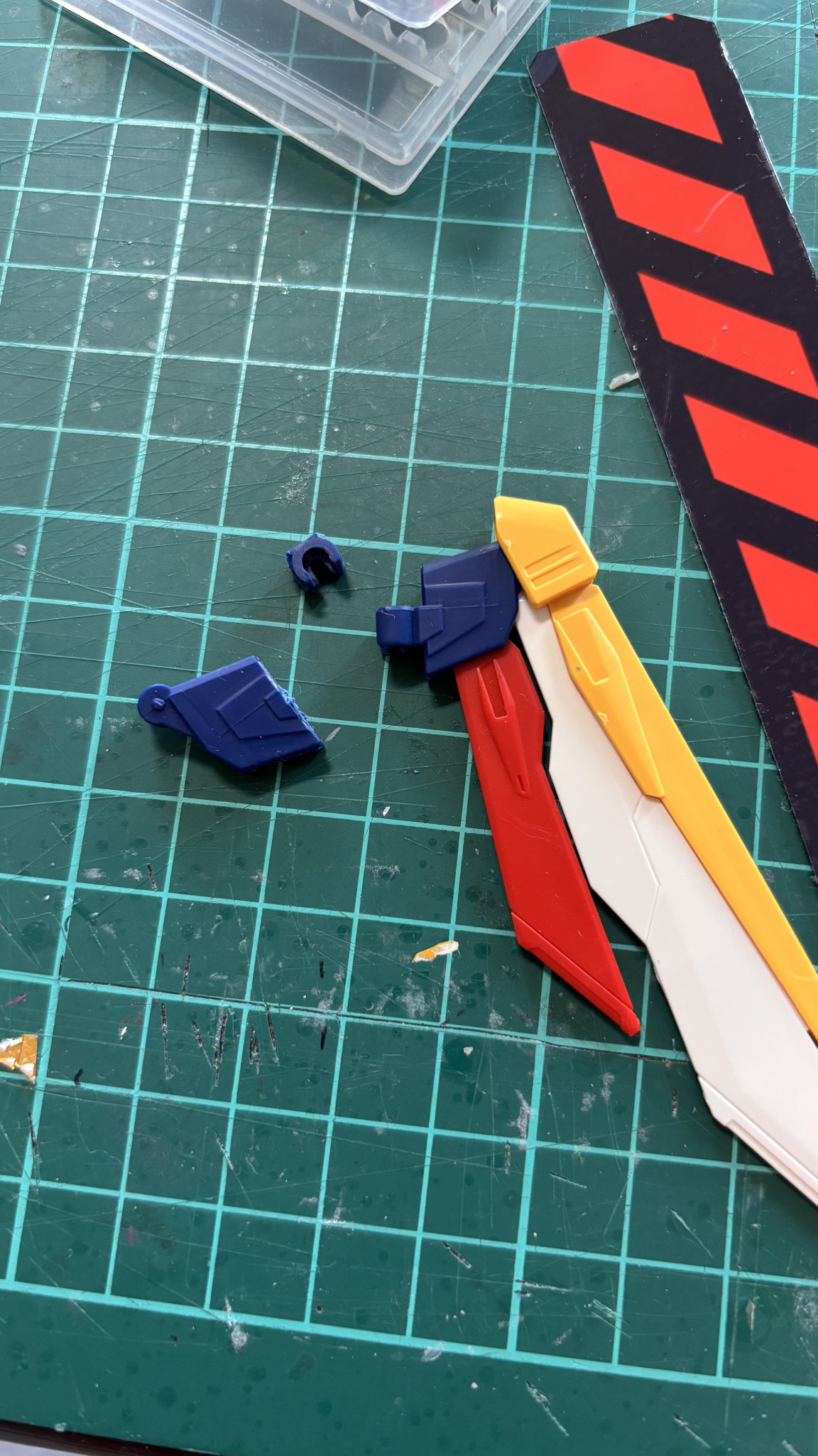 鉤爪がスライドしたらかなりそれっぽくなると思うんですけどね、色々考えた末に秒で断念しました笑 青の成型色パーツってなんか柔らかくて加工がしにくいんですよ。筋彫りも失敗したので新しくプラ板貼って貼り直しました。