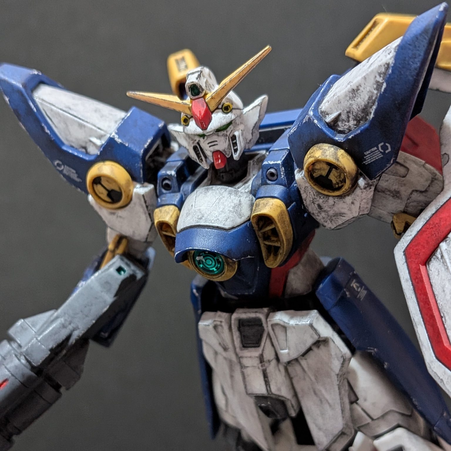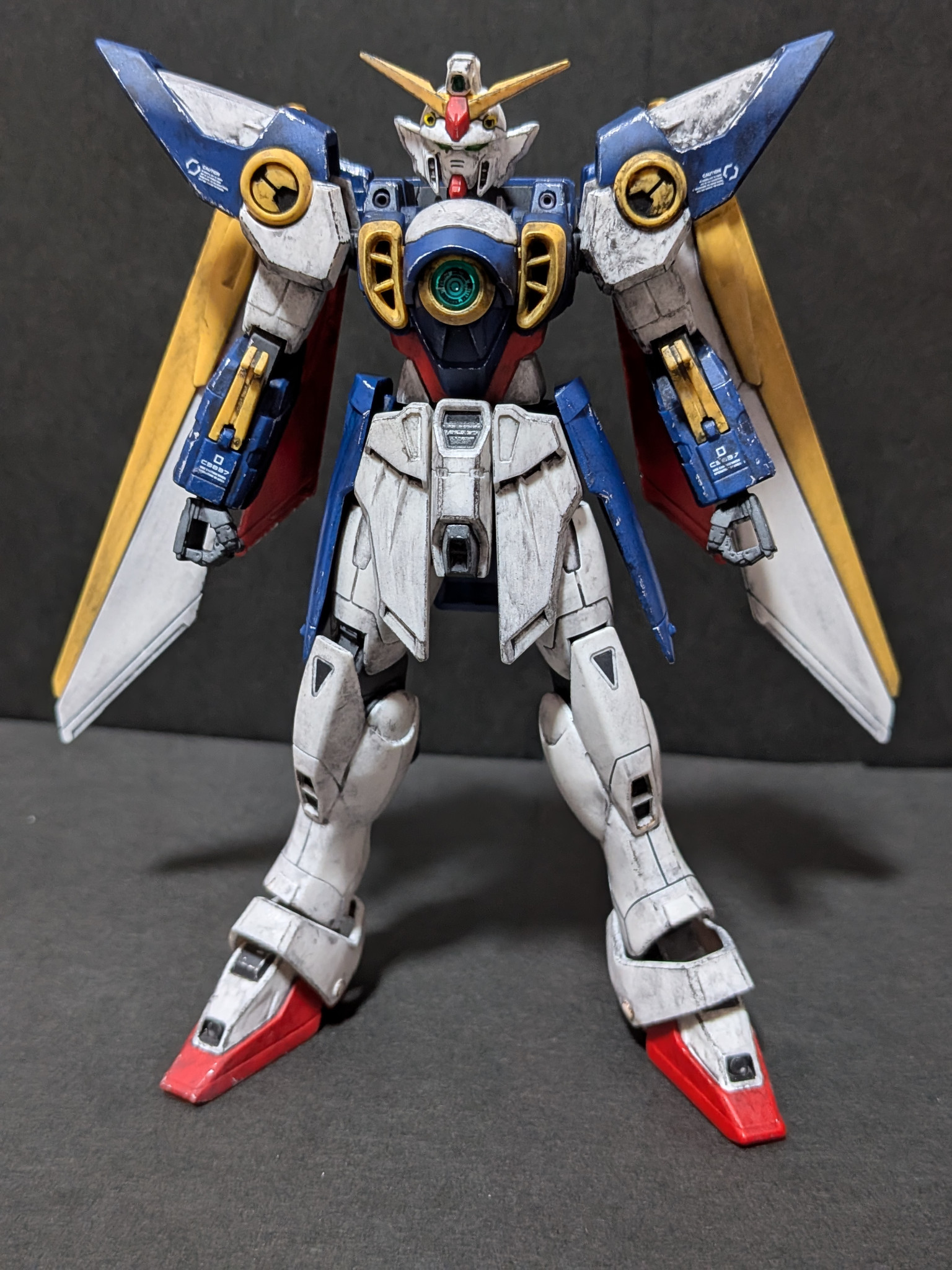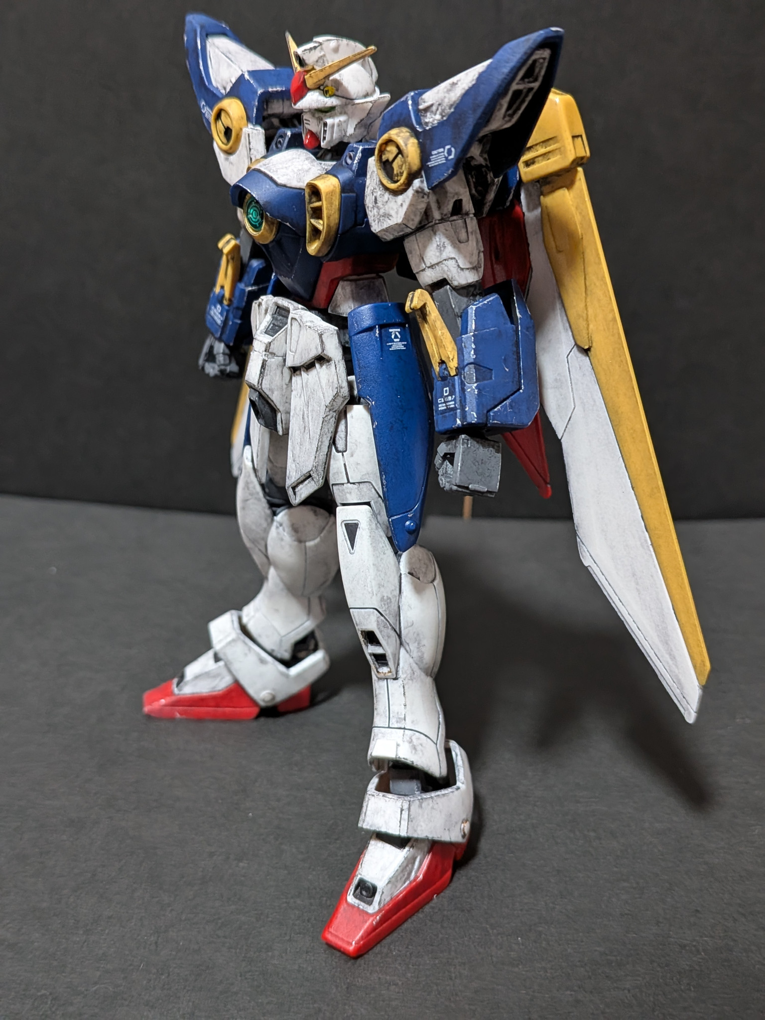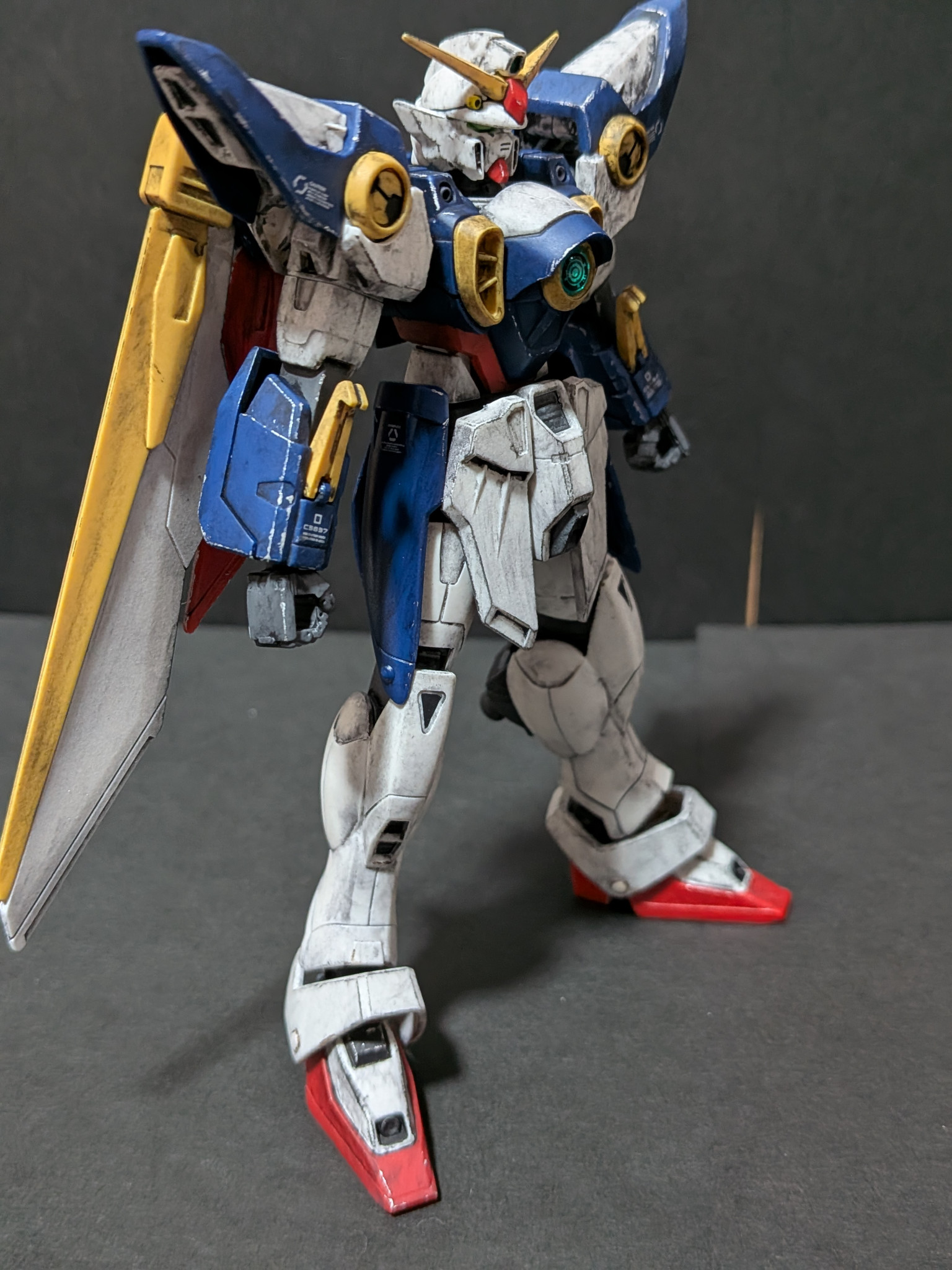 バルカン砲、肩アーマー、胸部ダクト、脚部ダクト、シールドを部分塗装しあとは成形色のみで全体的にウェザリングをしました。ウィングガンダムはガノタならだいたいわかると思いますが作中の扱いが酷かったから遠慮なくウェザリングしまくりましたw;