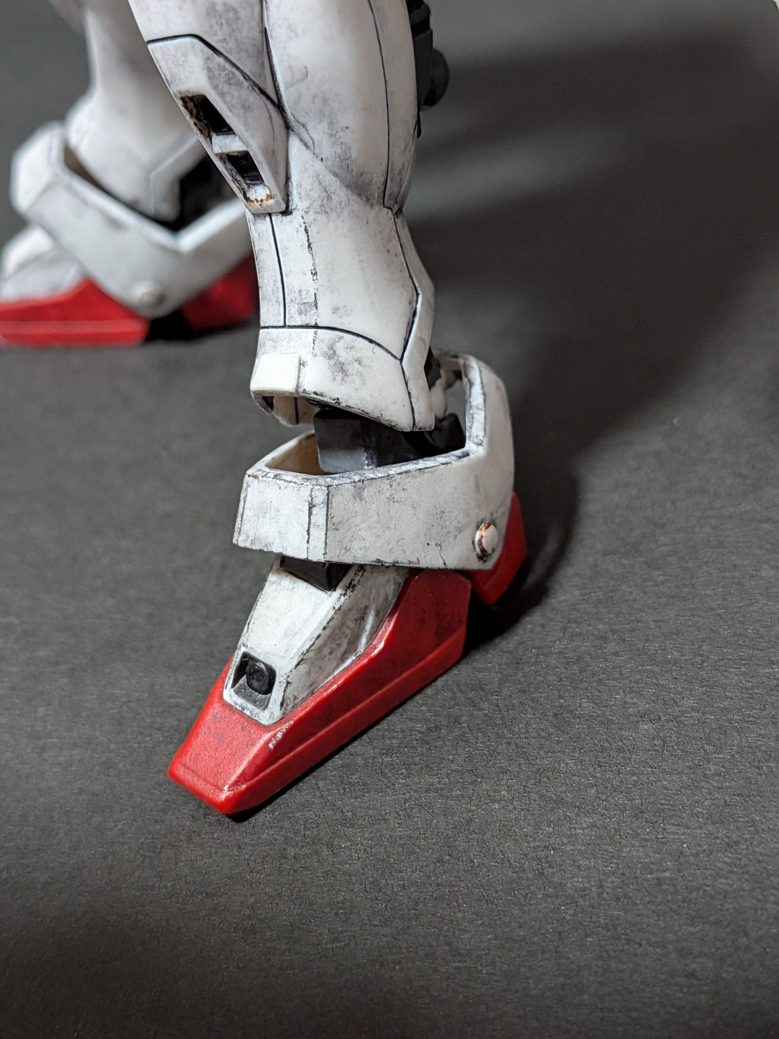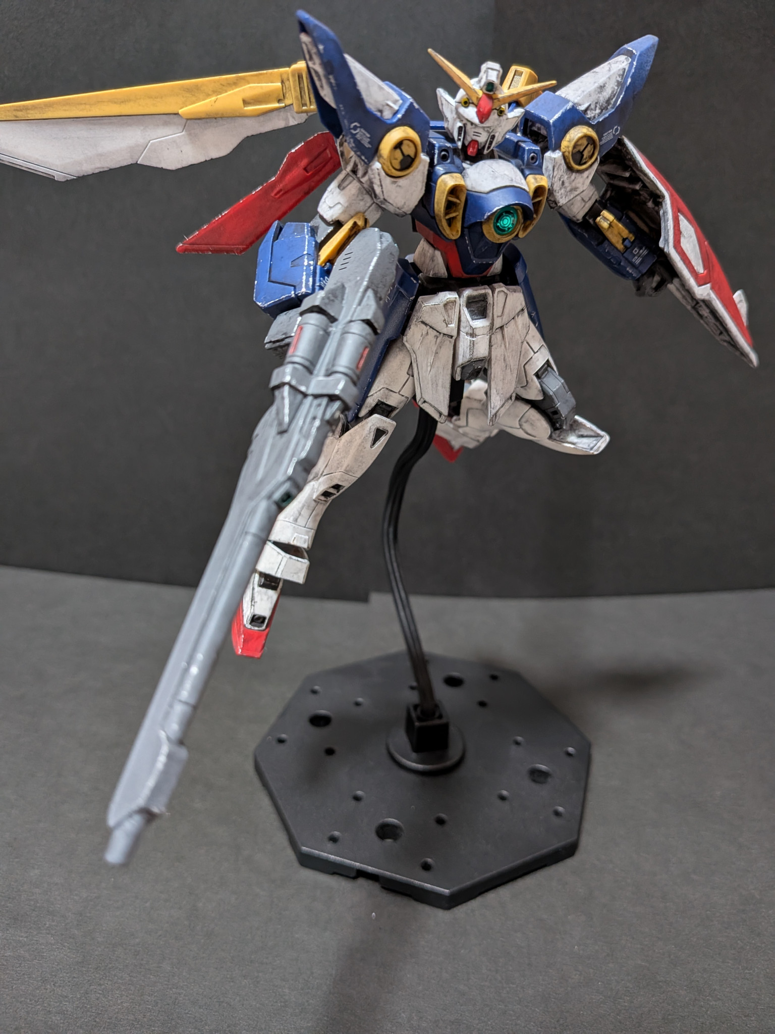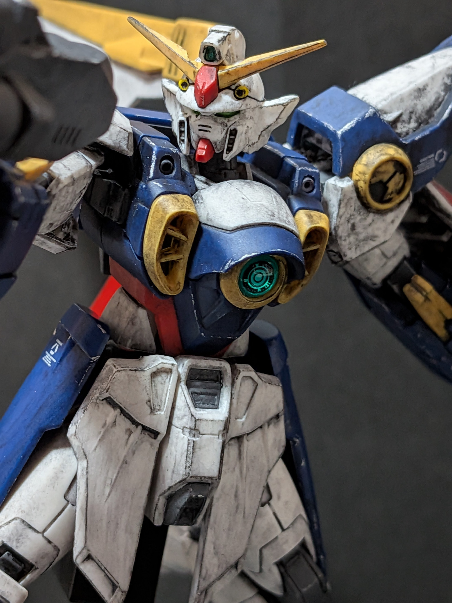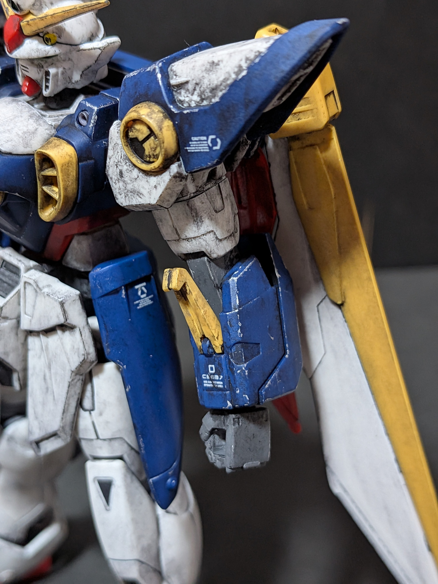 バルカン砲、肩アーマー、胸部ダクト、脚部ダクト、シールドを部分塗装しあとは成形色のみで全体的にウェザリングをしました。ウィングガンダムはガノタならだいたいわかると思いますが作中の扱いが酷かったから遠慮なくウェザリングしまくりましたw;