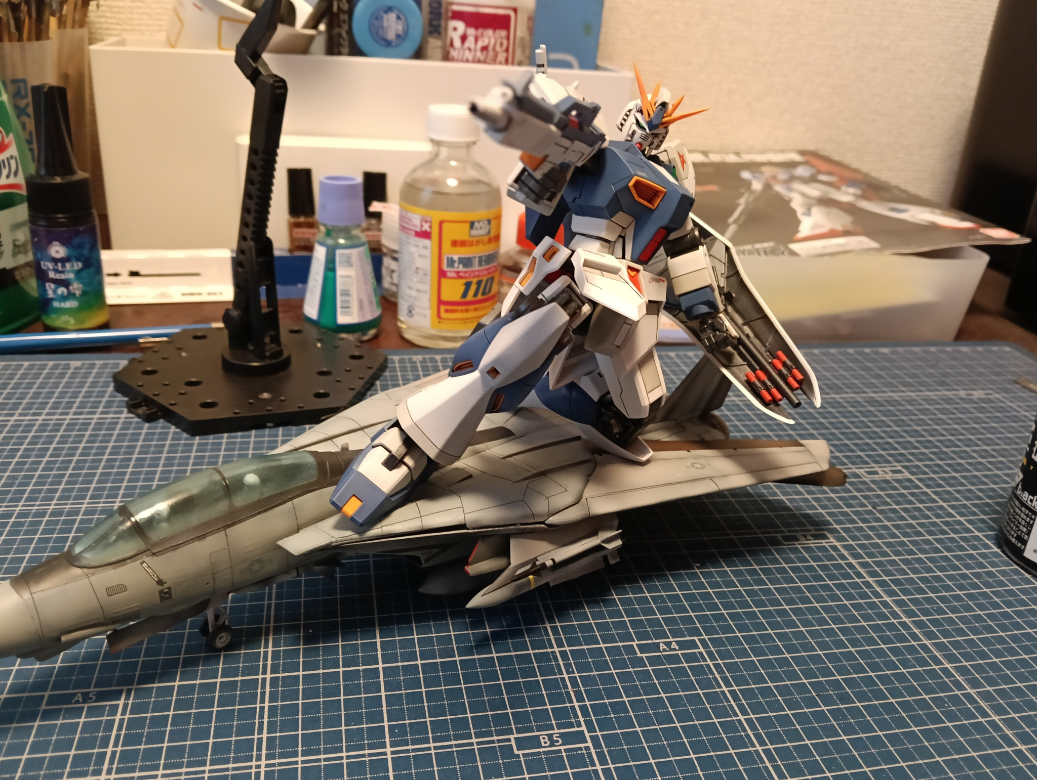4つ目はトップコートです。ガイアノーツのEx-クリアのつや消しとフッ素入りのつや消しを半々にしたものと光沢を7:3で吹いてみました。表面がツルツルで、ツヤ控えめ、フッ素のトップコートで微妙に色が変わる問題(僕だけ?)も解決したので僕的にはかなり成功でした。