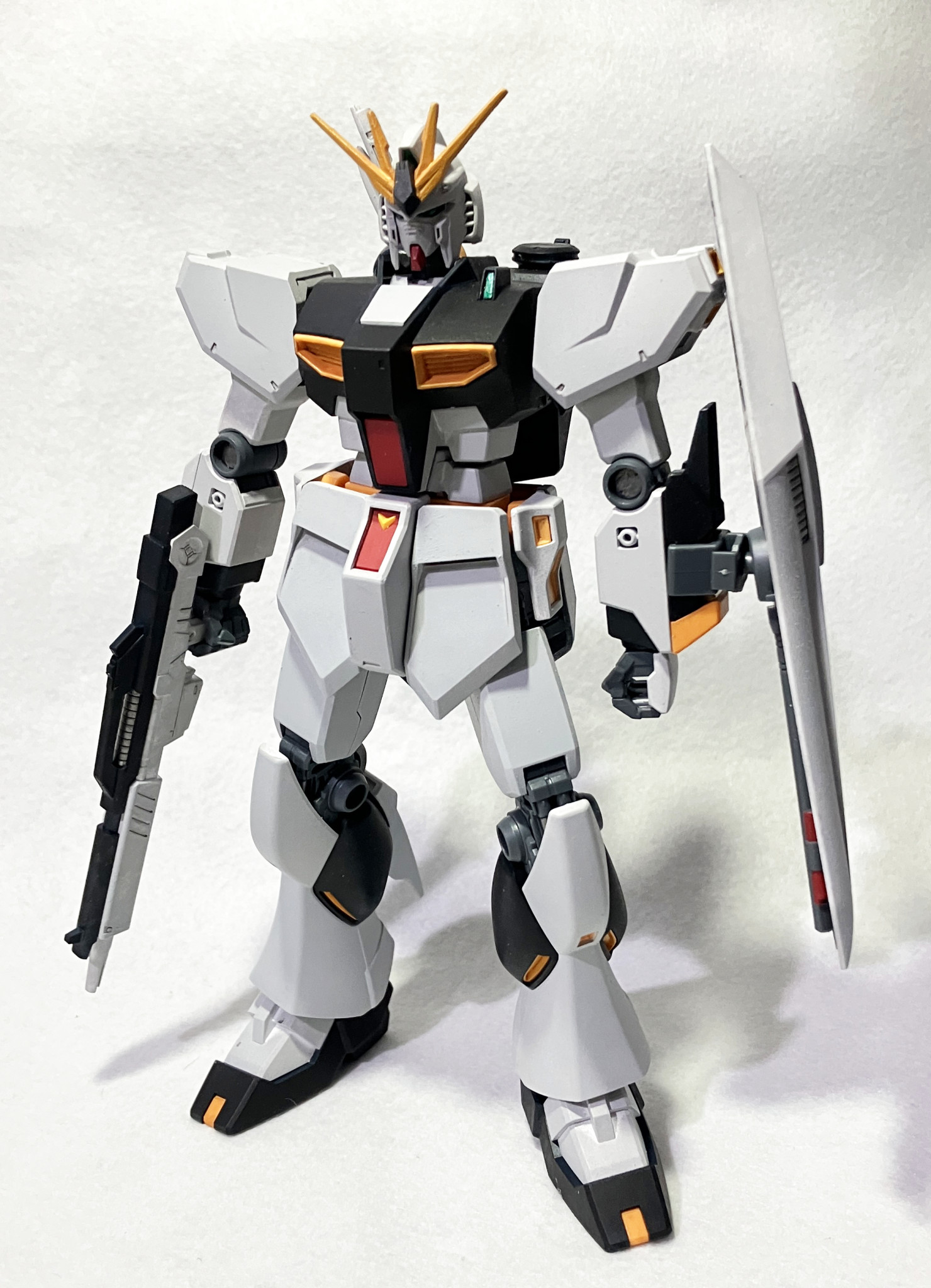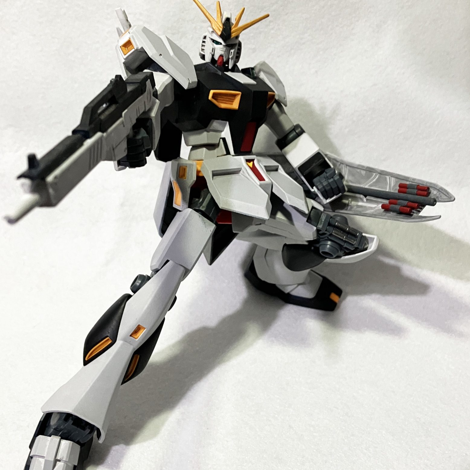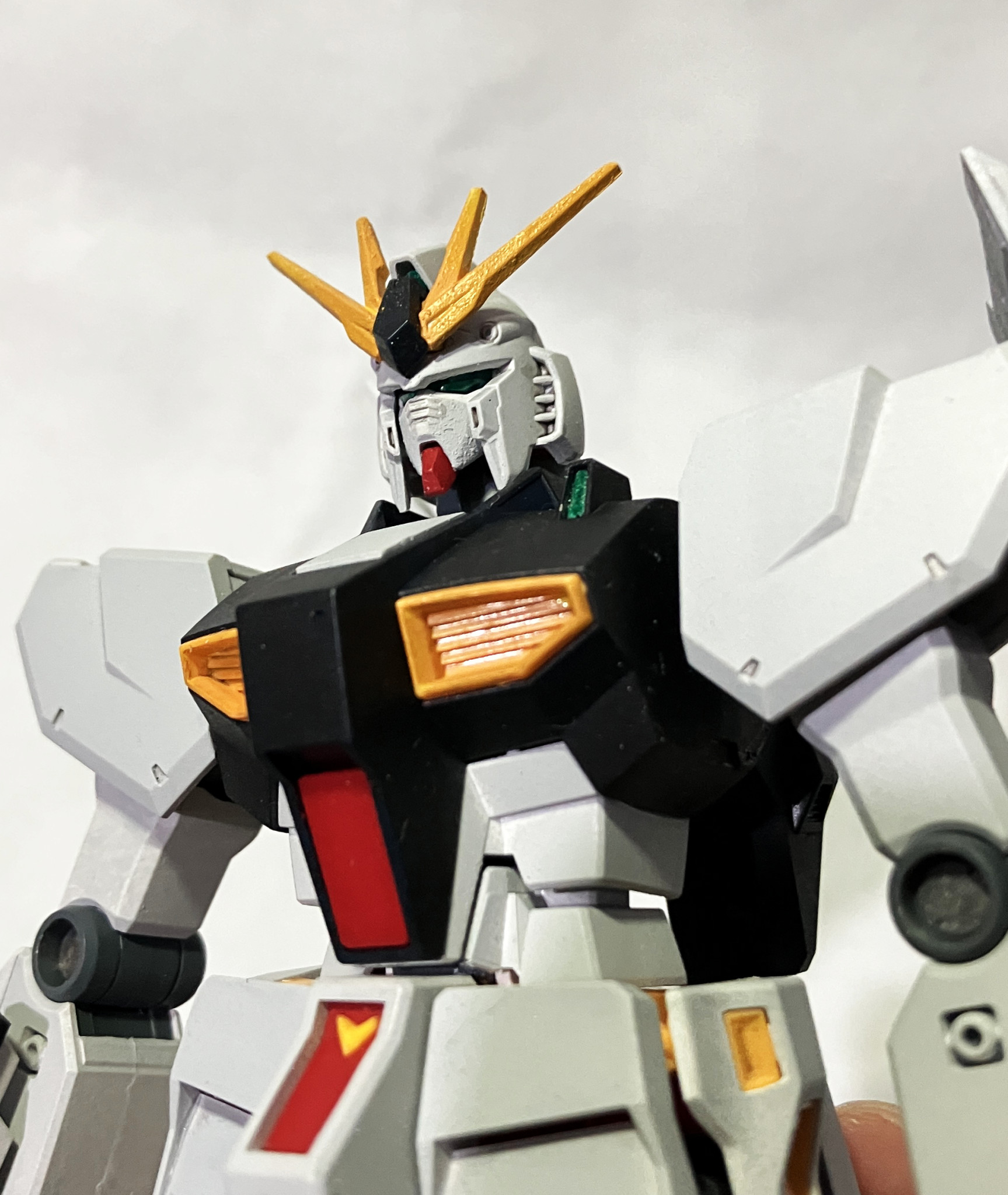 白い部分、胸などの黒い部分は成形色活かしつつの全塗装、その他のパーツはスミ入れやシリンダーっぽい部分に銀色を入れたりの部分塗装。グレー部分は成形色がよかったのと、手持ちの塗料で色味がほぼ同じだったので塗っていません。
