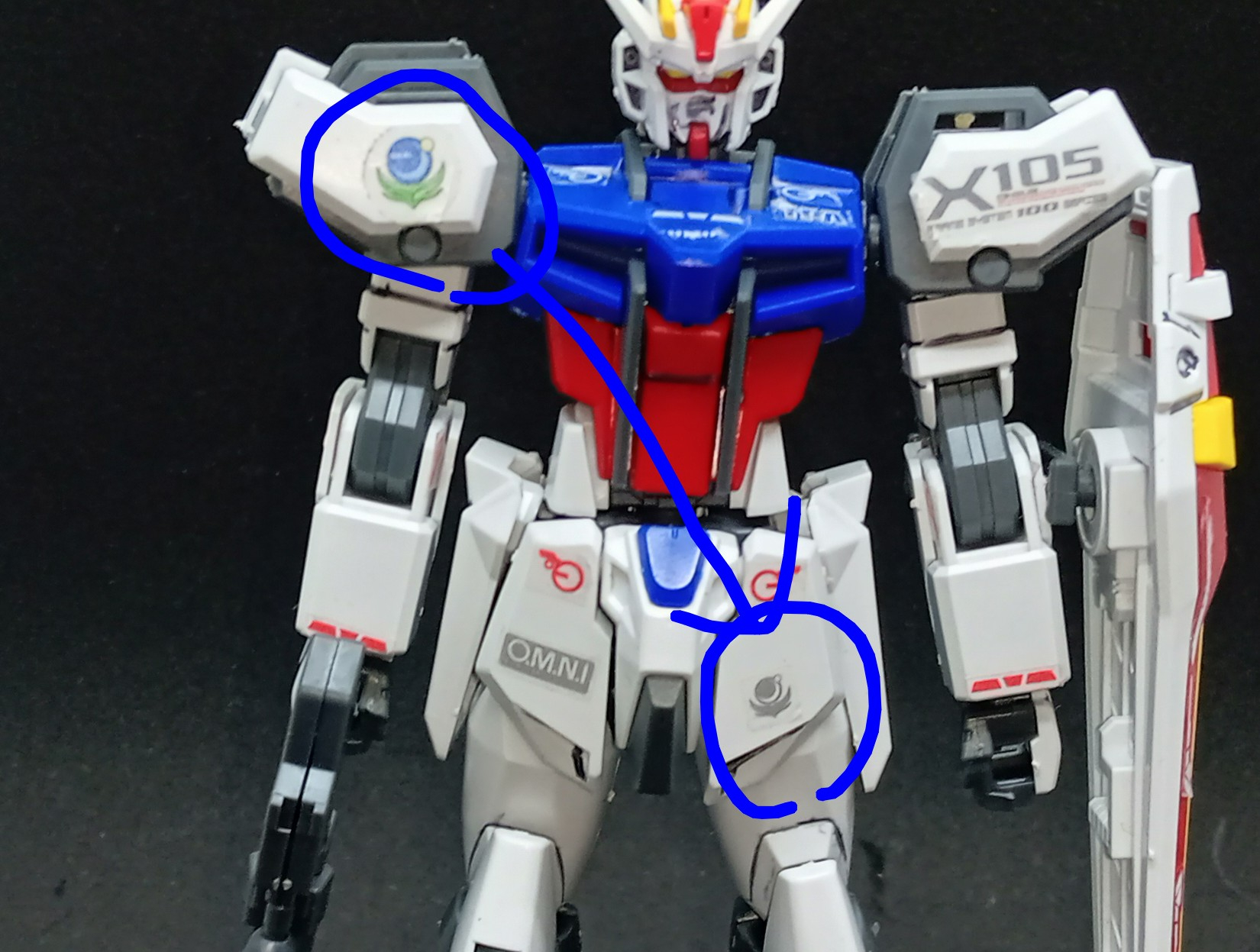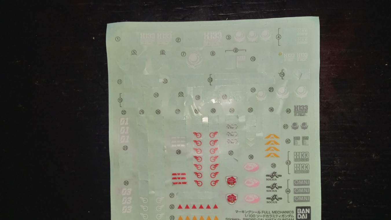 フルメカニクスのソードカラミティでマーキングシールを貼り付けたいところをチェックしていた時、フルメカニクスのソードカラミティにも余剰シールがあったのを思い出し、そちらを活用して貼り付けてみました。