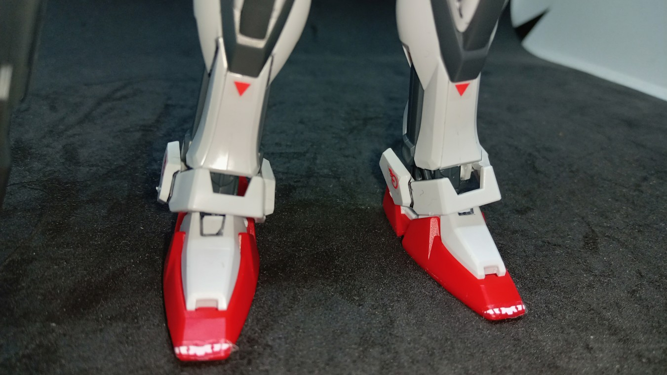 百均で使ったのはシールドの縁のところと覗き穴(ビームライフルを入れる口)の上のところ、ストライクの足の赤いところですね。