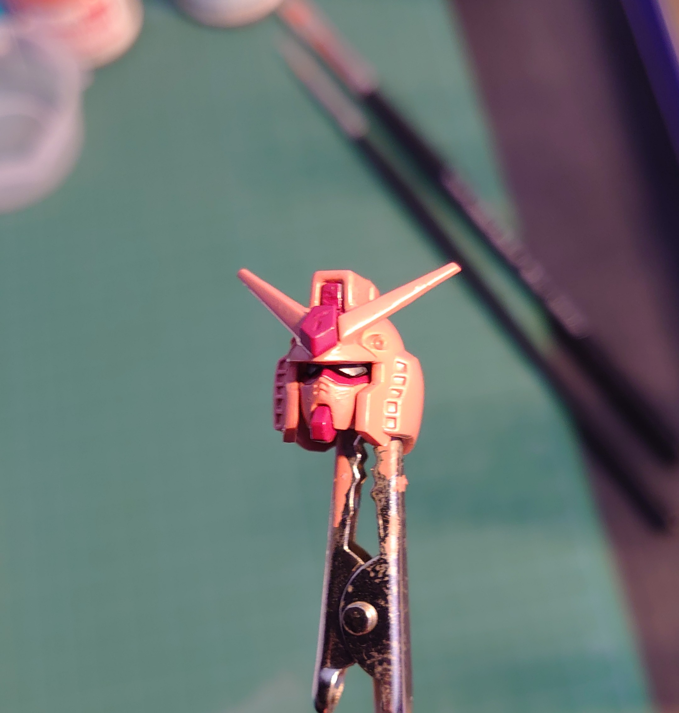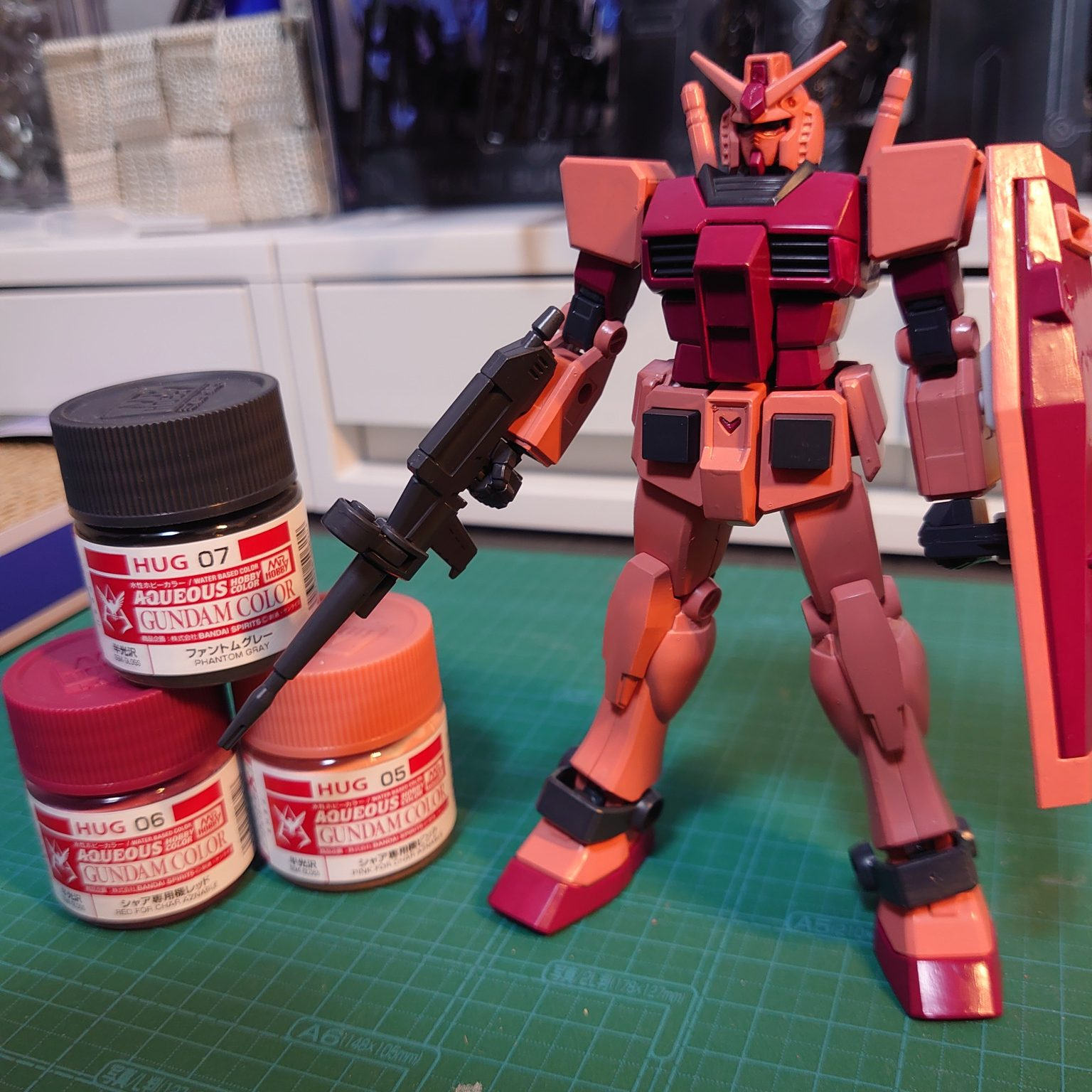 使用塗料はほぼ水性ホビーカラーのシャアピンク、シャアレッド、ファントムグレーの3色で、部分的にバーニア部分に焼鉄色、ビームライフルのスコープに黄橙色なんかを使ってます。