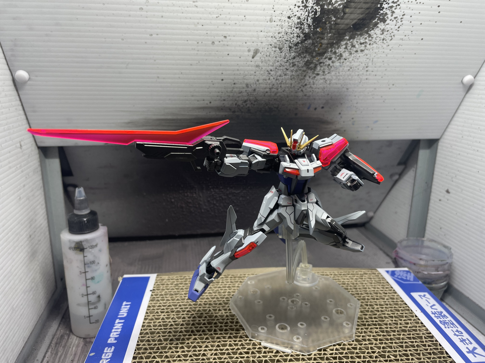今回は先日購入したビルドブースターセットも同時に制作し、自分だけのブースターを作りました。完成間際の組み立て中にジョイント部分を破損し、萎えかけましたがEGストライクを急遽購入し、完成に漕ぎ着けました。。。今回もエクシードギャラクシーのみですが白だけグラデーション練習しています。