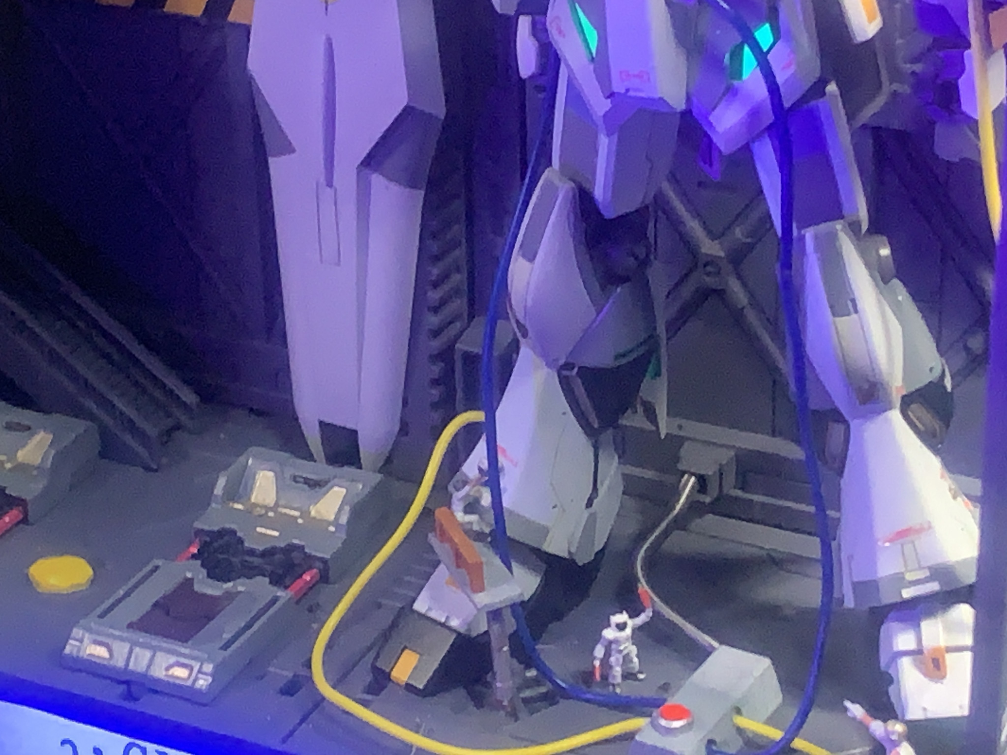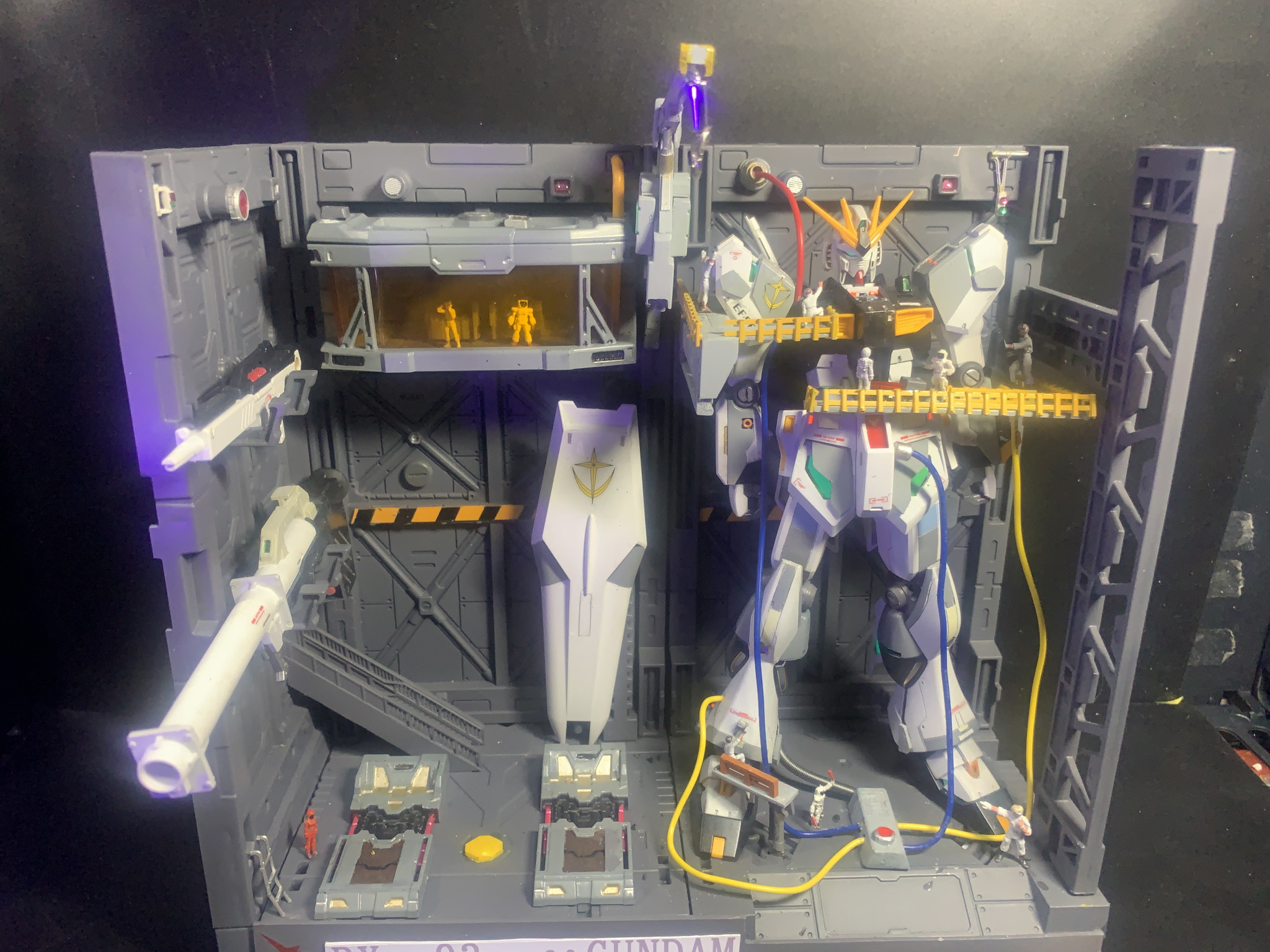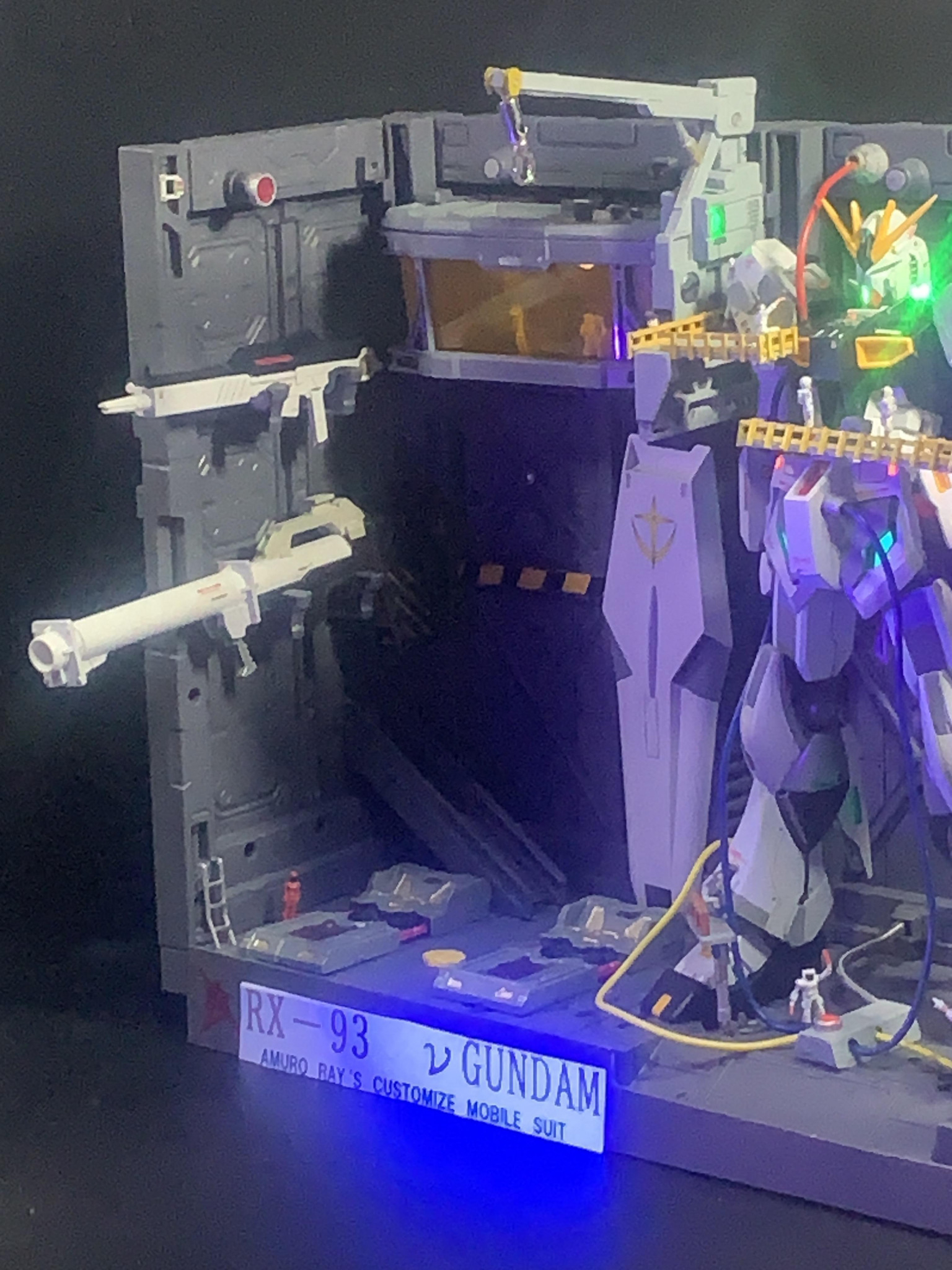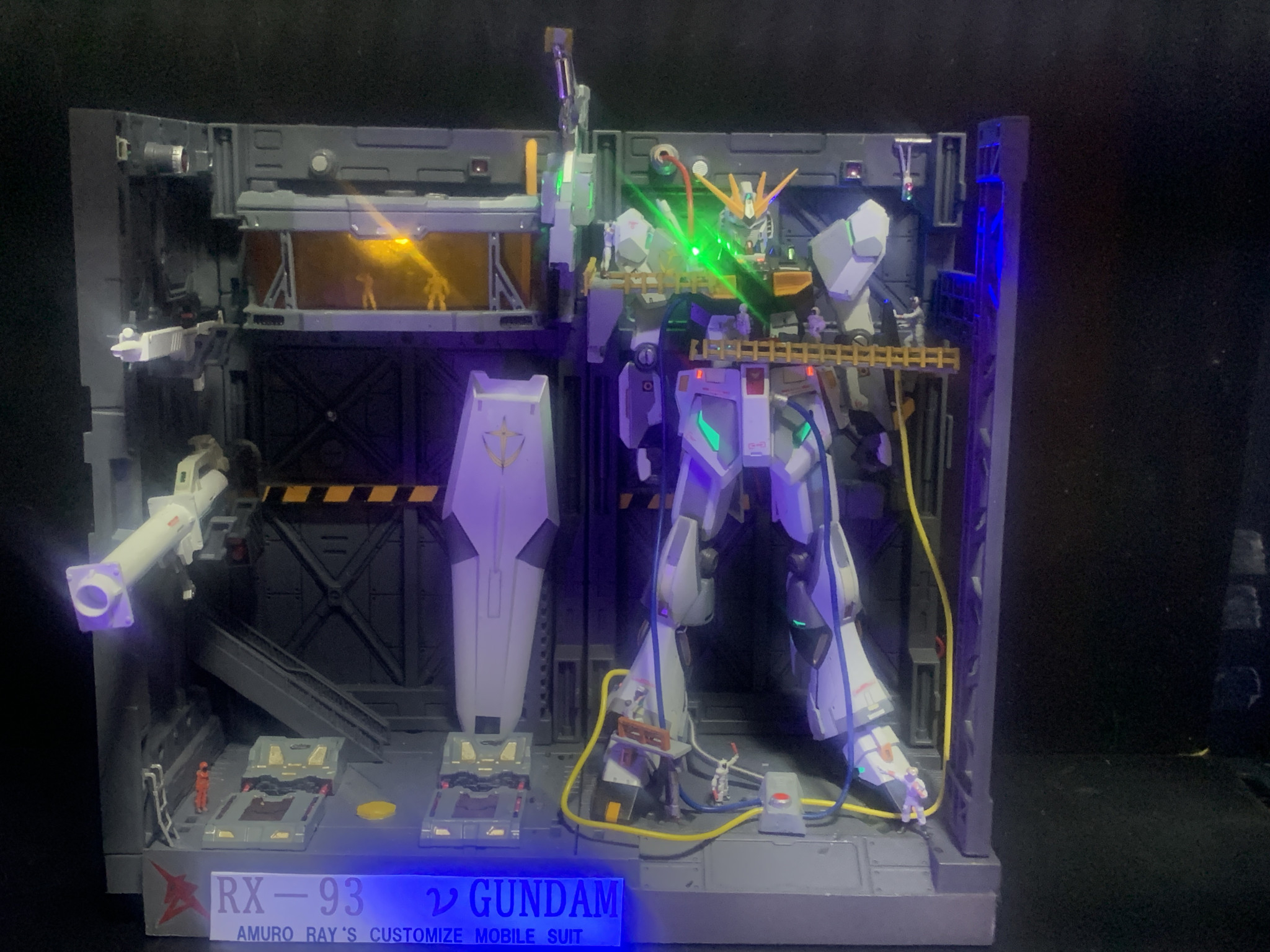 格納庫は各所LEDライトにて電飾化しています。νガンダムの目やサイコフレーム部は蛍光塗装を施しUVライトを当てています。