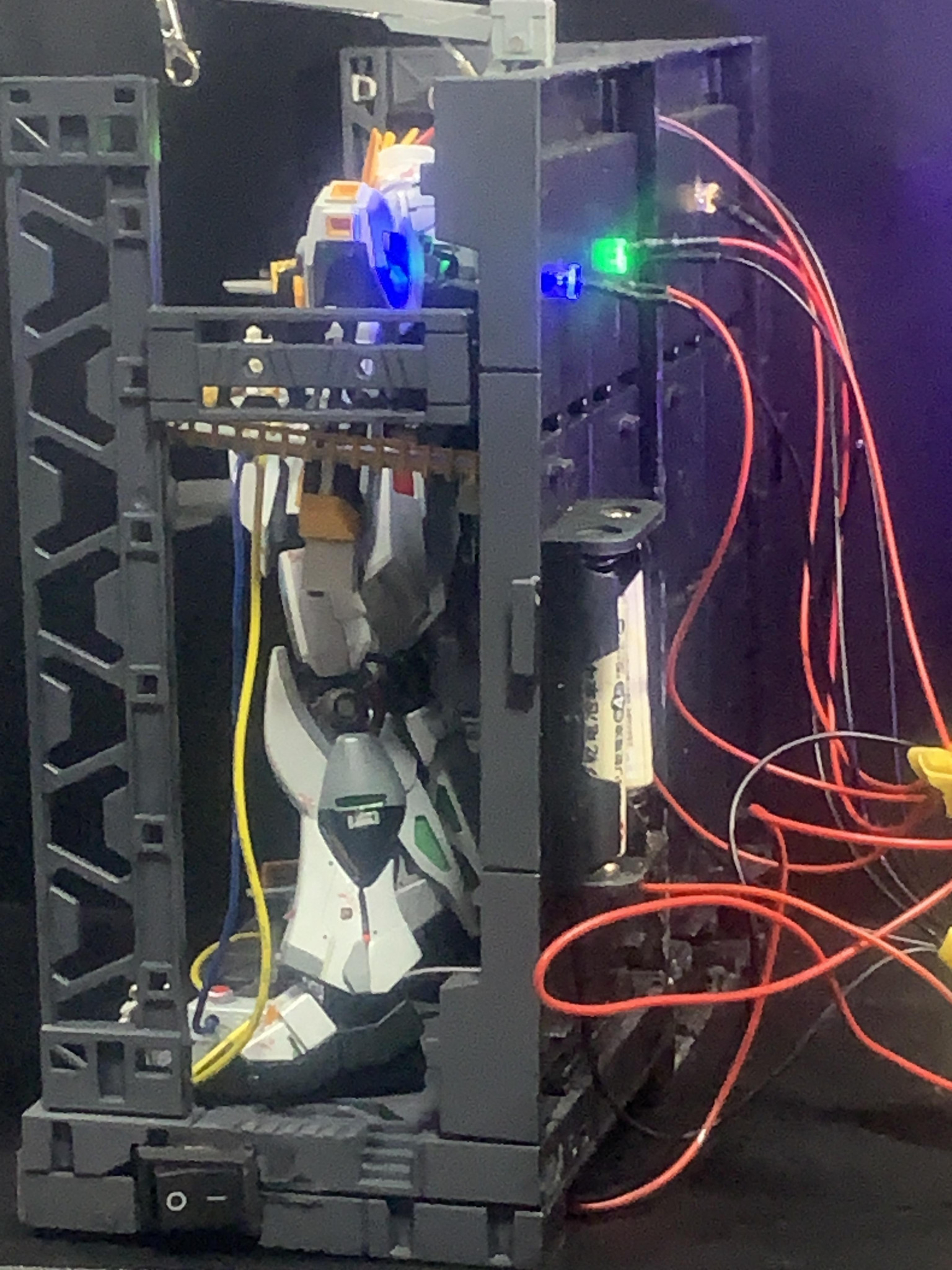 舞台裏、単四電池二本を使用。AmazonにてLEDライト、電源スイッチと電池ボックスを購入しハンダにて配線しました。これらも単価はかなり安く助かります。(gundam-kao5)