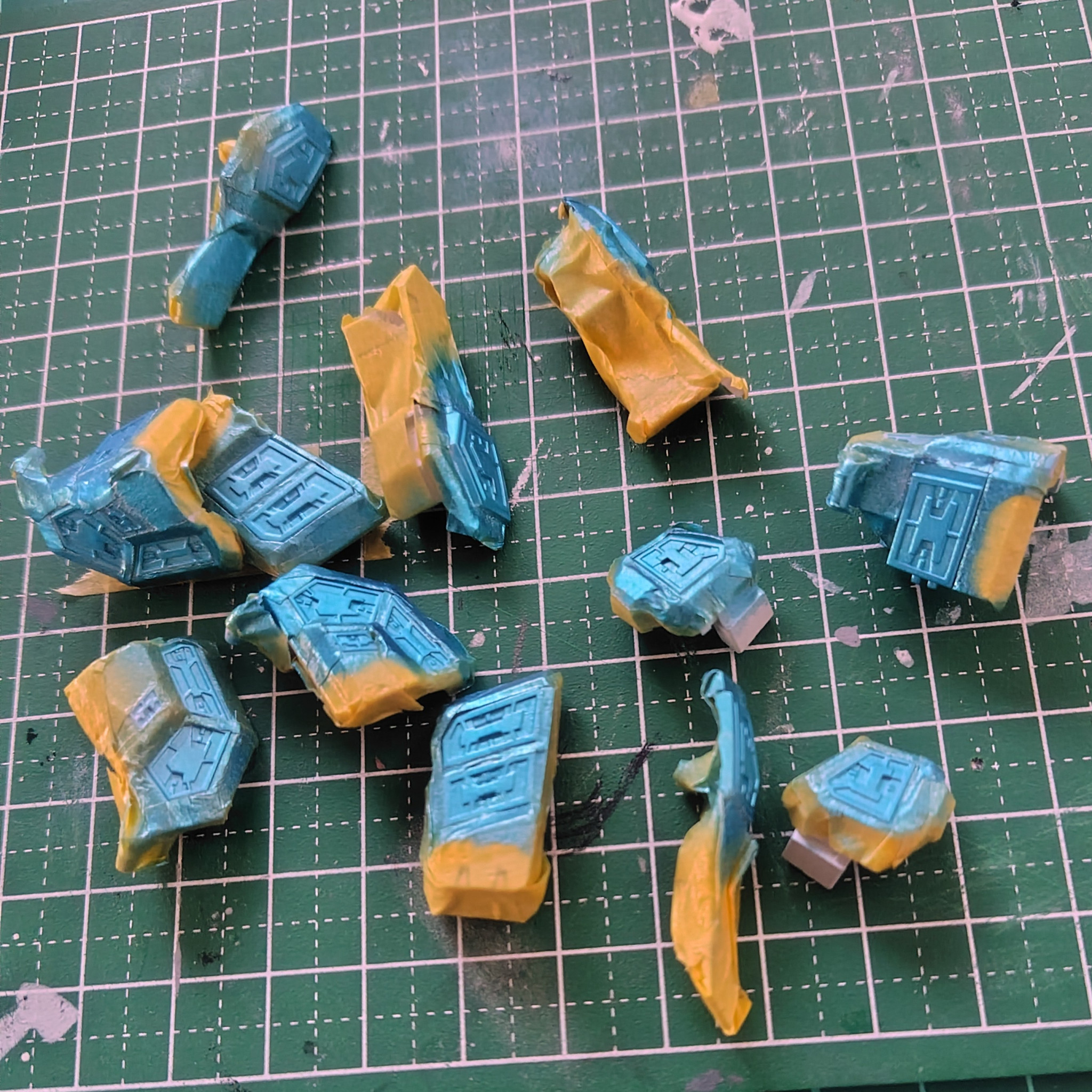 塗装でも思ったほどラクではなく、これだけガッチリとマスキングしても貼り残しがあったのか、何箇所か色がはみ出ていました。また羽のパーツはモールドが浅かったので、主要なモールドを掘り直しました。
