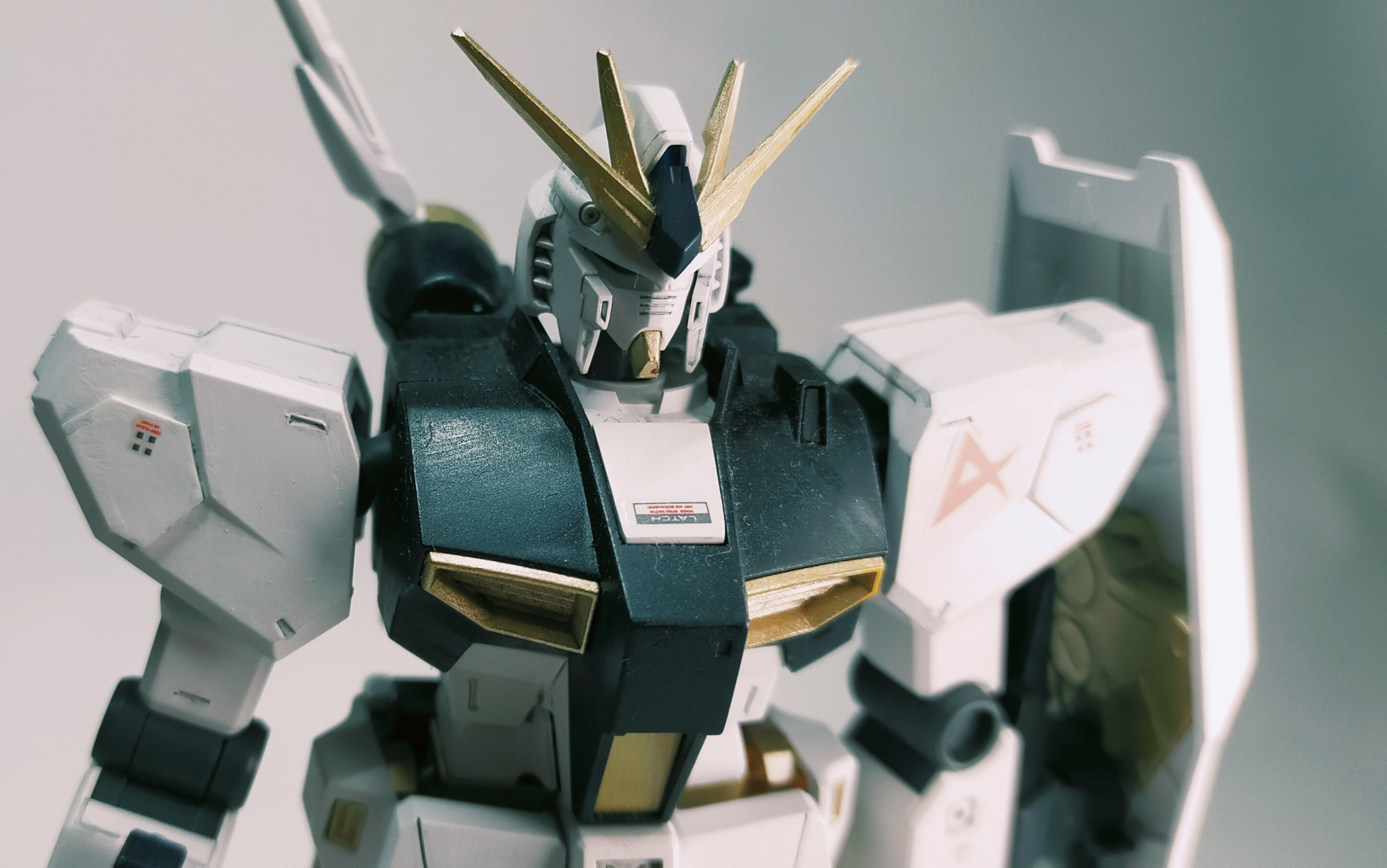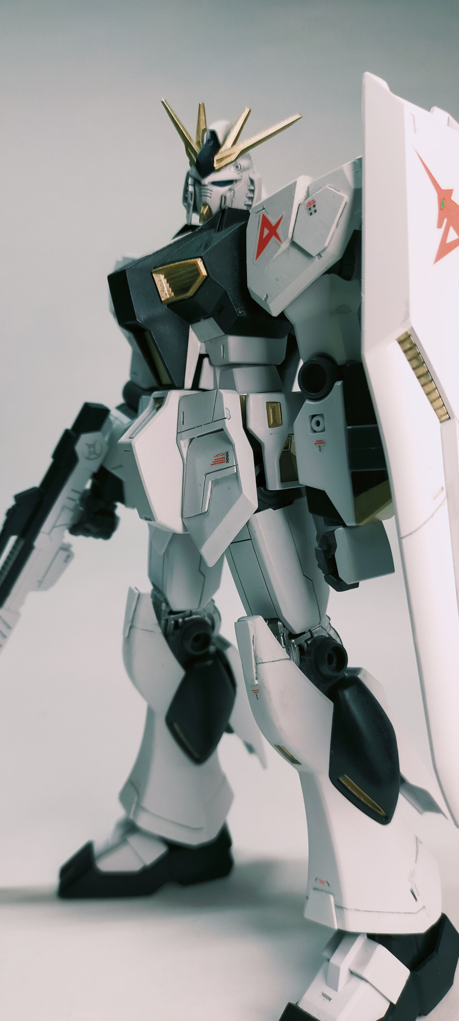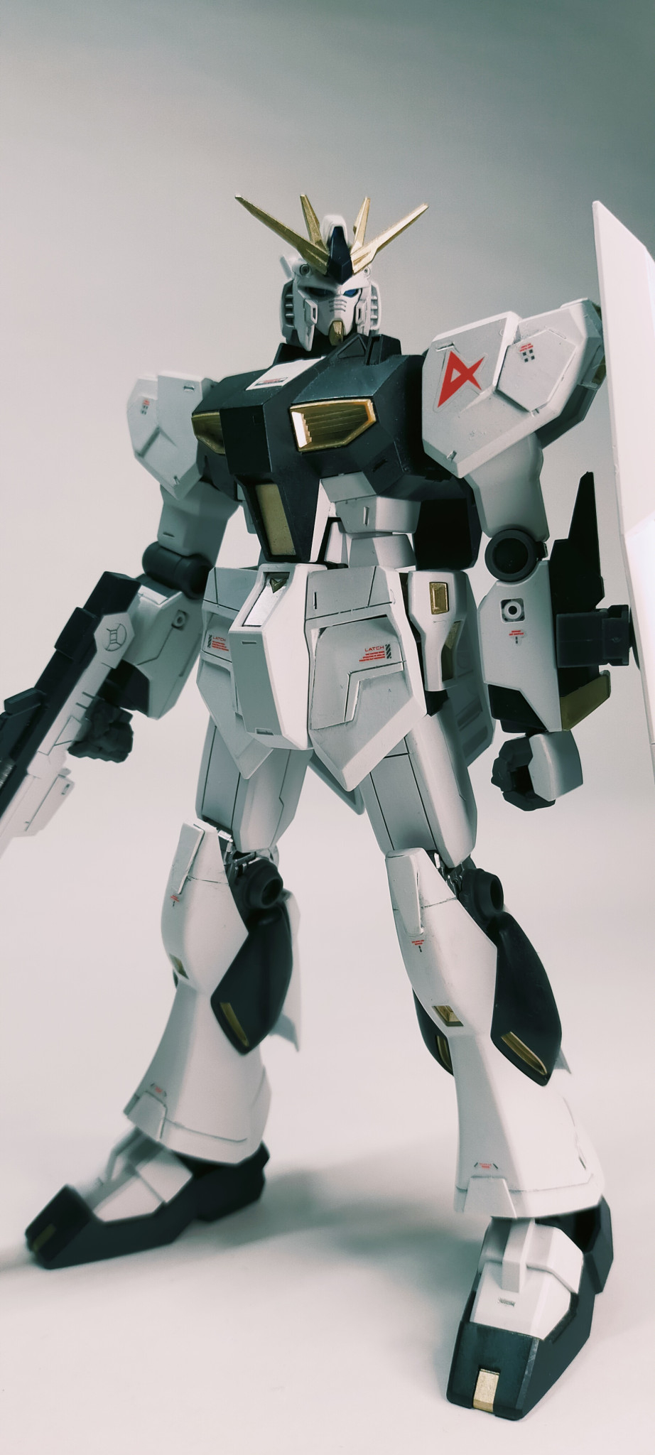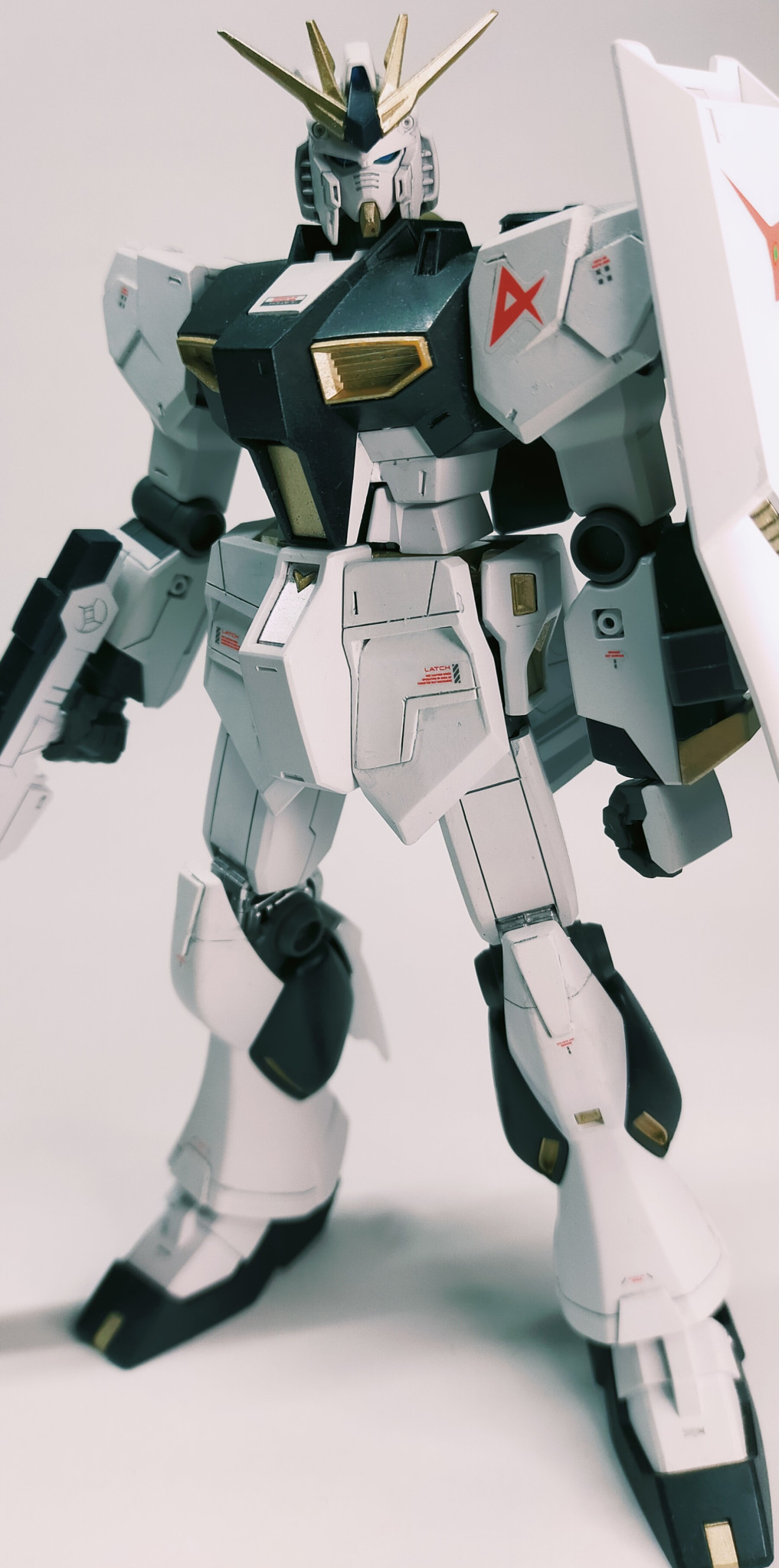 エントリグレードのνガンダムに筋彫り・スミ入れ・プラ板でディテールをチョイ足し.全て筆塗りです.