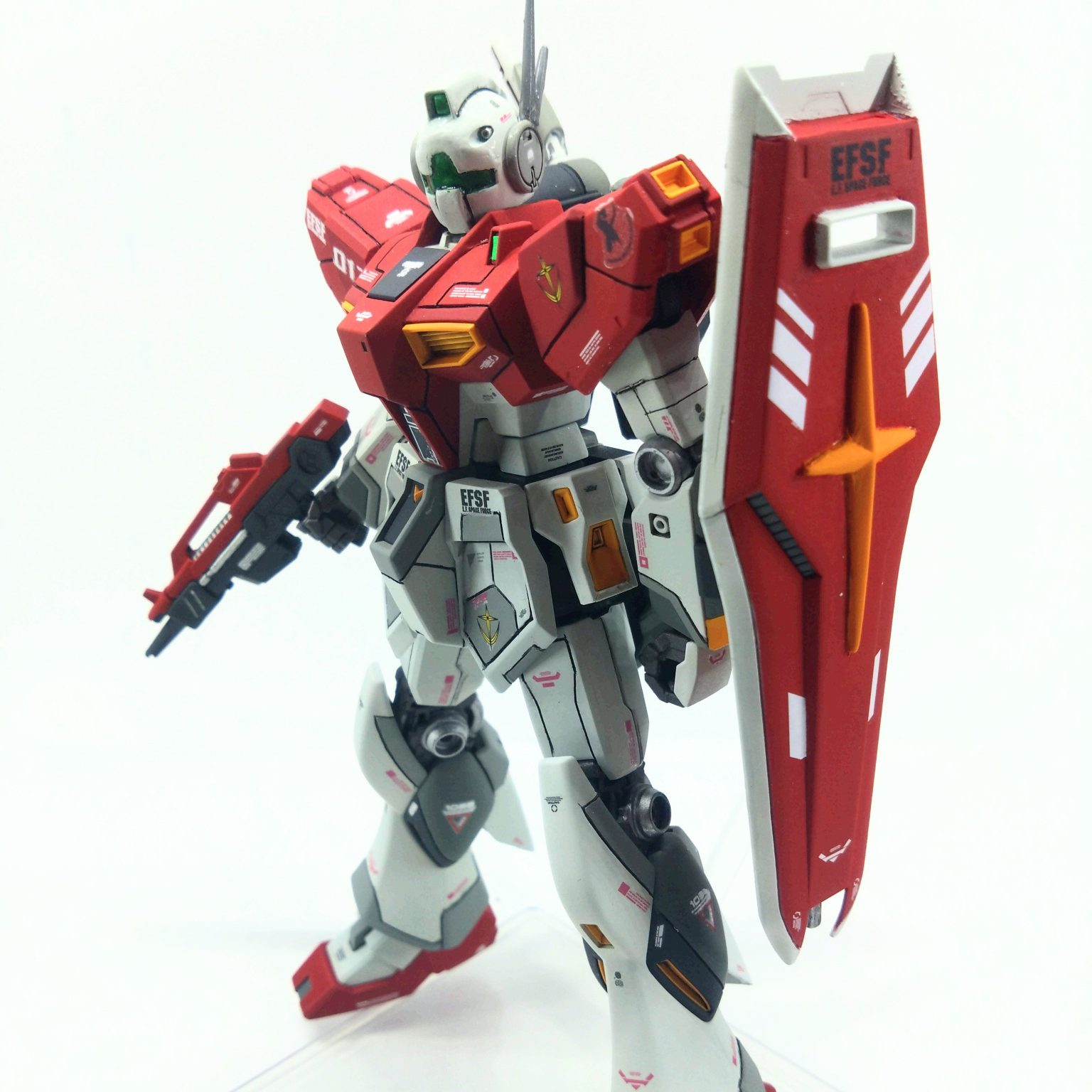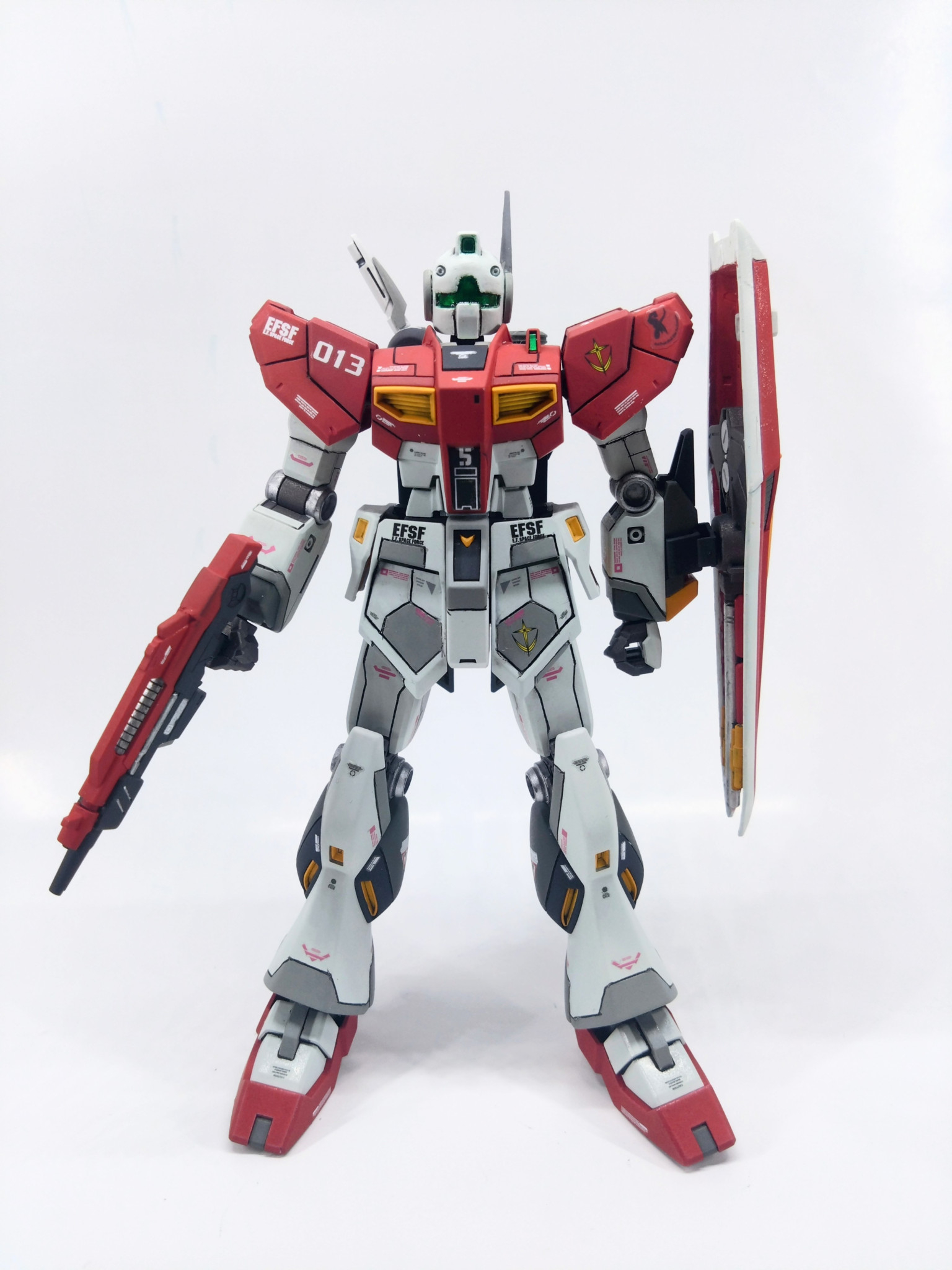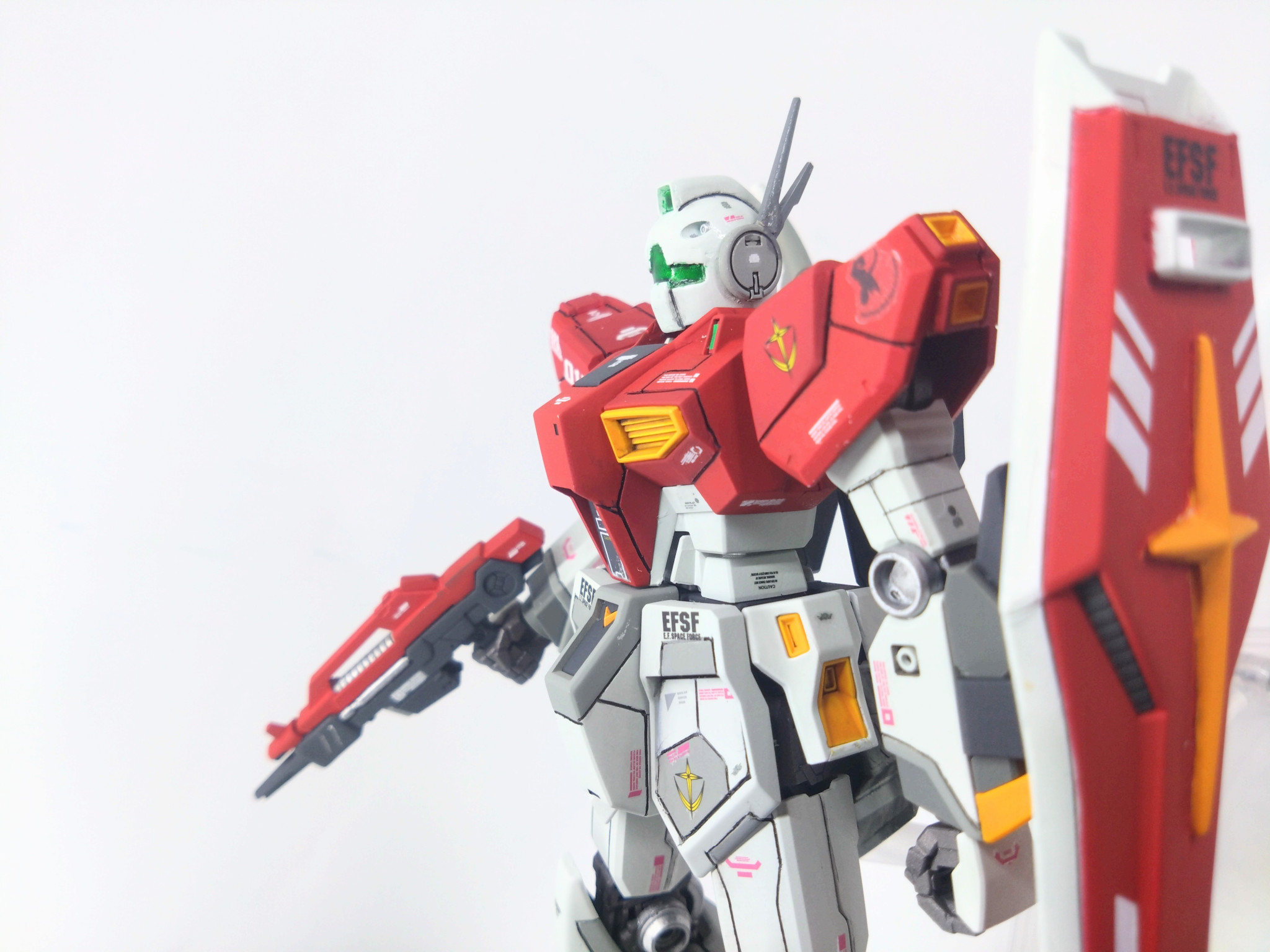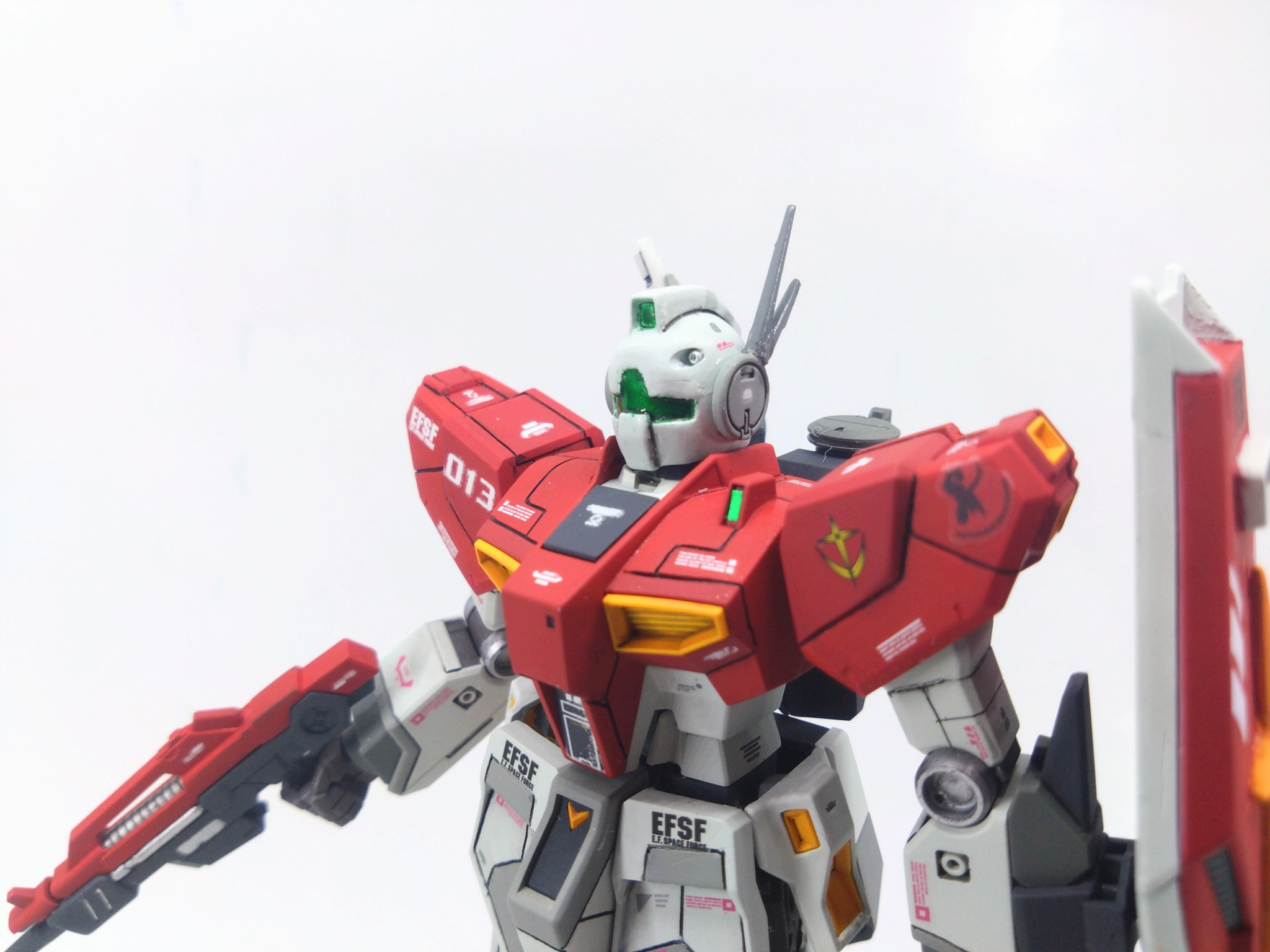 ジム要素は顔とシールド、カラーのみ。顔はちょっとだけ進化させてみました。アンテナはνガンダムのを流用。シールドに覗き穴を作りお馴染みの十字マーク。ビームライフルも短縮してビームスプレーガン風にジムらしく。