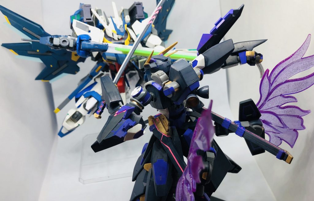 正面と背面。バックパックにブースター、腰にファンネル付きウイングバインダー、肘と膝に追加装甲を施しました。