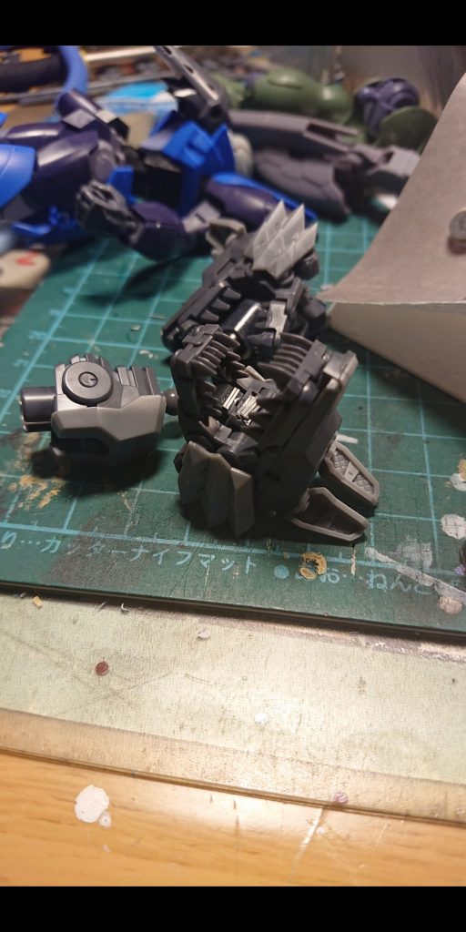 頭部の変更にあたって頭部とバックパックの干渉が確認されたので、ネオジム磁石を重ねて高さを増して、それを隠すためにプラ板で周囲を囲いました。