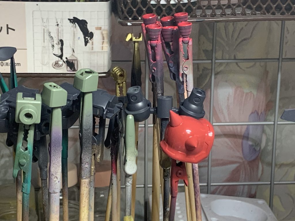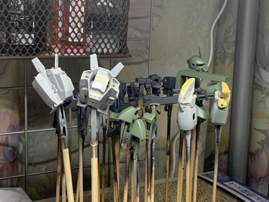 使用した塗料。この辺を調合したので二度と同じ色には出来ません。関節部や武器は毎度おなじみメカサフで塗装。