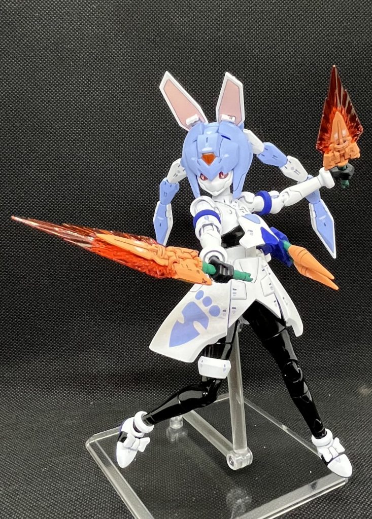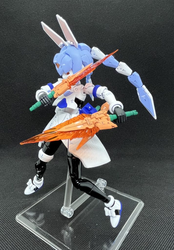 メンバーシップ限定機、という設定で野ウサギさんも2体作成。HGBF R35グフのブースターポッドをベースに、耳はサンドロックカスタム、人参は旧キットガンダム武器セットの砲弾、尻尾はプチッガイから。
