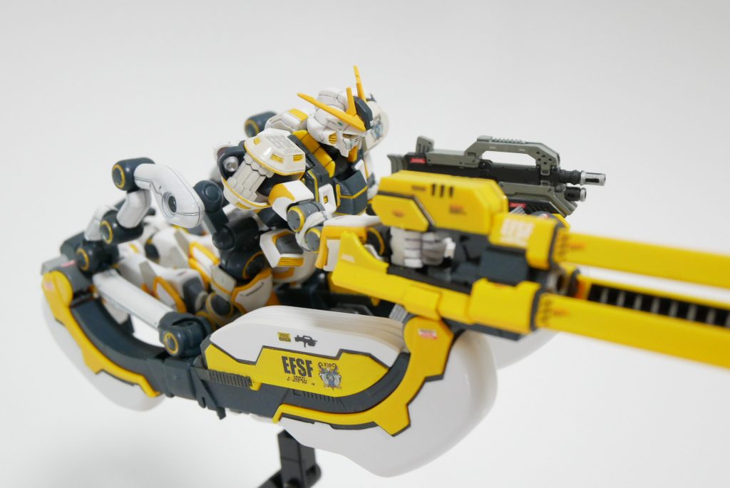 太田垣康男作による「機動戦士ガンダムサンダーボルト」に登場するモビルスーツ。パイロットは、イオ・フレーミング。水陸両用型でサイコ・ザクに対抗できるMSとして開発されるも、サブレッグ・ブレードシールド・レールガンなど、カラーリングも含め、オリジナリティー満載のガンダムです!!