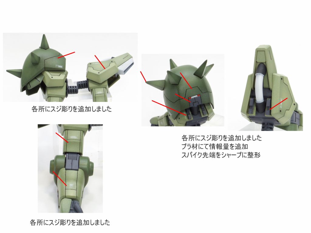 太ももをプラ板にて1mm幅増ししました。 各所にスジ彫りの追…