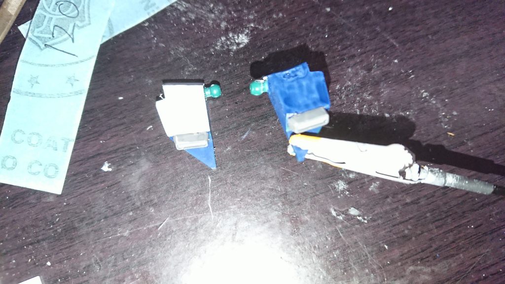 サイドアーマーの部分はパテで埋めて、脚横の翼が付いていた部分はプラ板で塞ぎました。