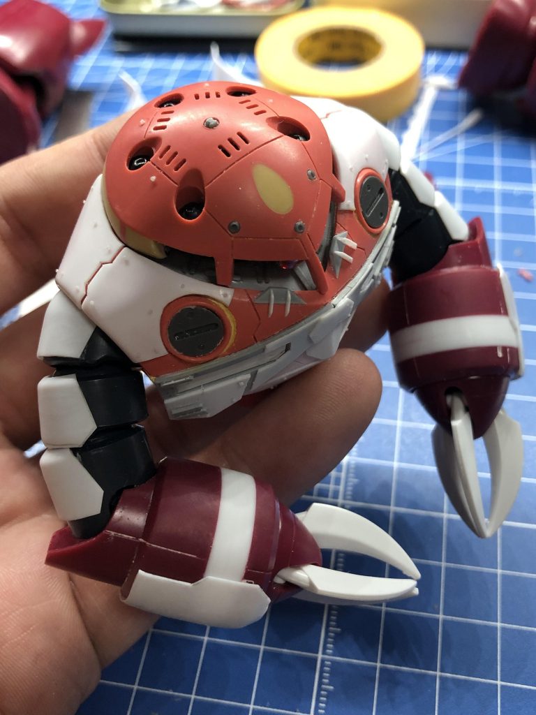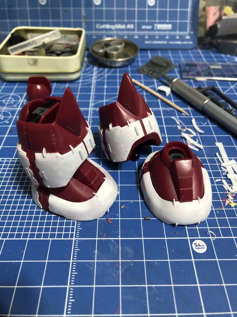 頭部→スジボリ、形状変更、モノアイHアイズに変更 ミサイル発射口を6から5に変更、モノアイレールを自作奥行きが出るように調整
