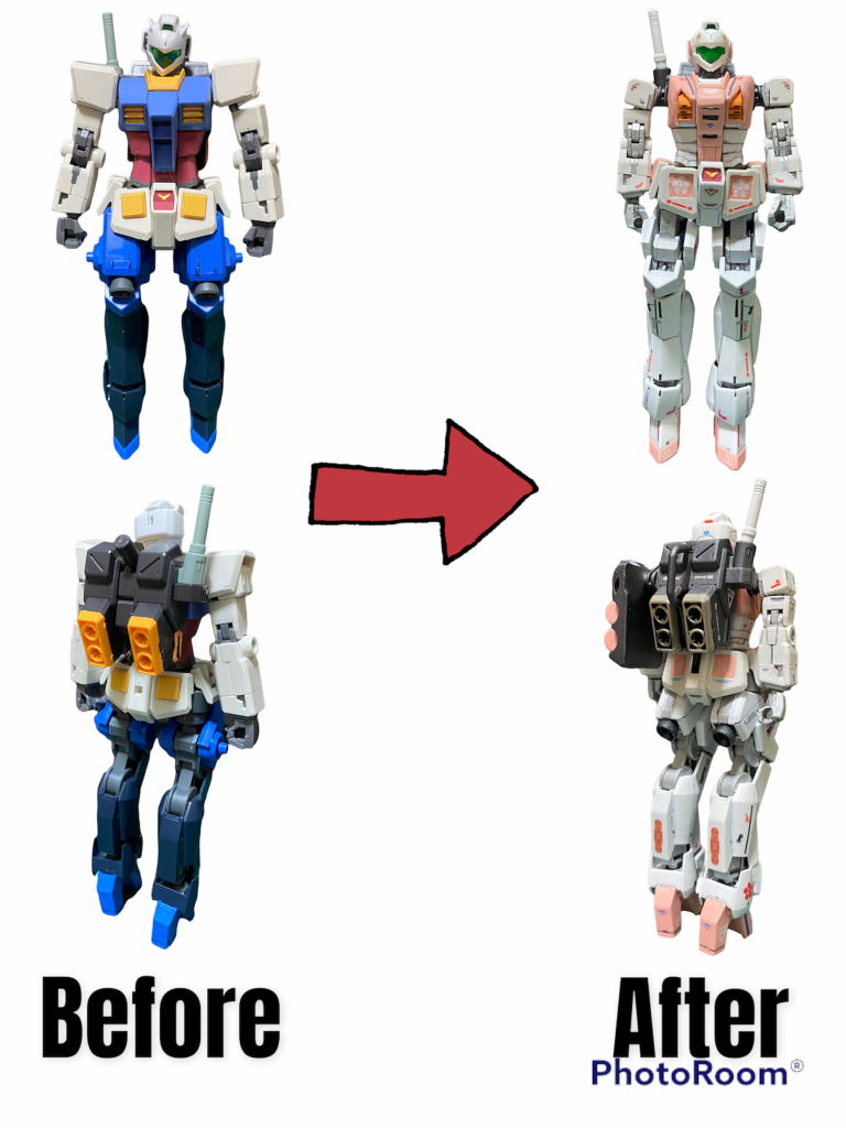 頭部は『GNアーチャー』、上半身+腰まわりは『RX-78-2 ガンダム [BEYOND GLOBAL]』、バックパックは『ジムストライカー』、脚部は『シュバルベ・グレイズ』をベースに 加工していきました。