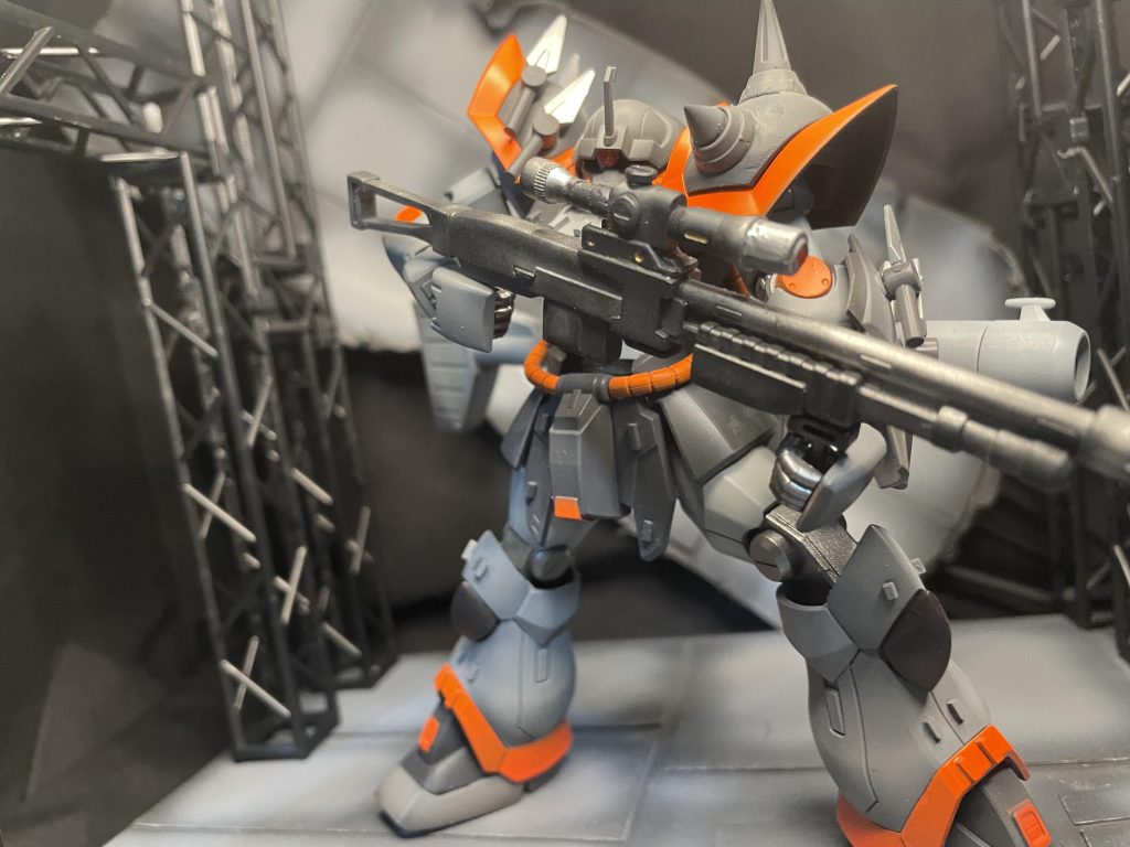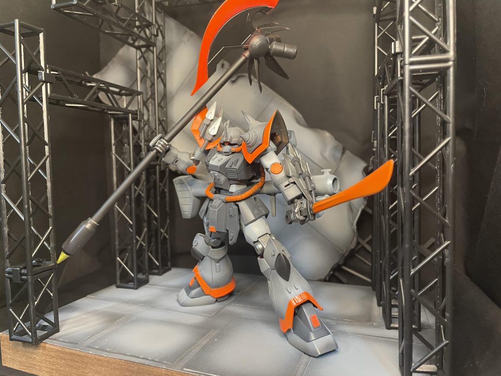 イフリートシュナイド作りました。多少のカスタムしてます。カラーは自分好みにしました。グフ用ヒートサーベル、テキトーな斧をカスタム、バックパックに30MMのスラスター付けました。