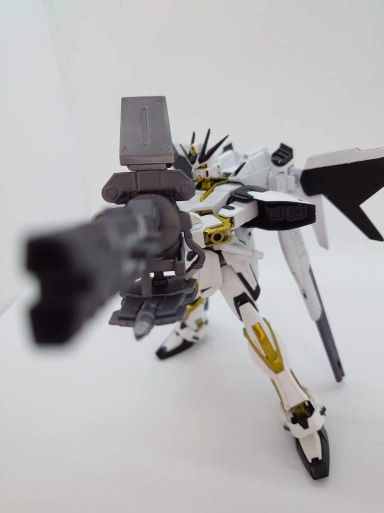 ビルドストライクガンダムをベースに白黒塗装に差し色をゴールドで。追加武装の「キエッリーニ」はジャイアントガトリング、チョバムシールド、強化ビームライフルのミキシングにて作製。