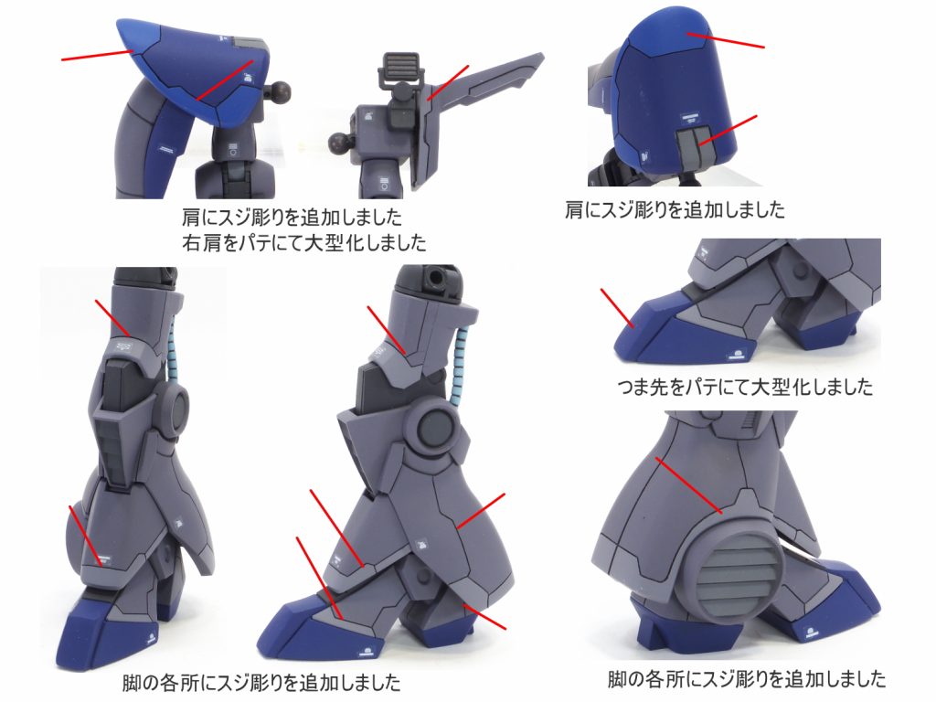 太ももをプラ板にて1mm幅増ししました。 各所にスジ彫りの追…