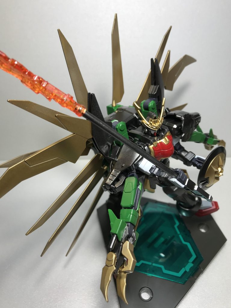薙刀はBB戦士三国伝の関羽ガンダムより。試しに持たせたらサイズ感もピッタリだったので、クリアレッドを塗って完成。