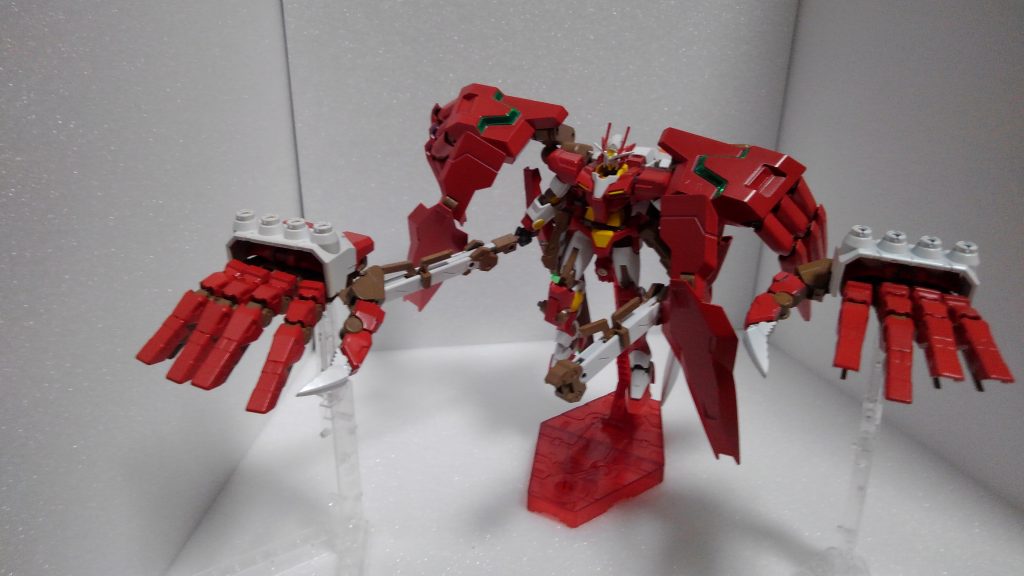 背中の2つの手は自身の防御と近接攻撃に特化し、腰から伸びる2つの手はジオングの手のように飛び回り砲撃や敵を握る様に拘束したりする事ができ、一騎でも十分に複数の相手を出来るようになった。