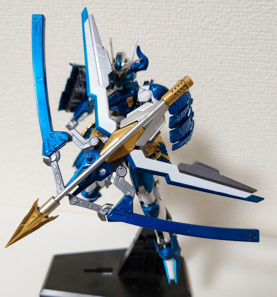 今回はついにガンダムエアリアルのキットを入手する事ができたので、早速武者化させてみました。エアリアルの特徴である分離するシールドをアレンジ出来ないかと試行錯誤し、分離パーツが合体すると巨大なボーガンになるオリジナル武装も作ってみました。