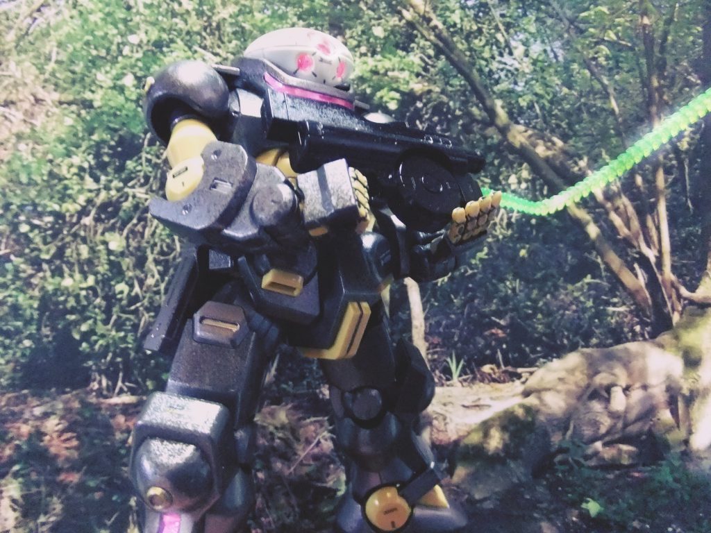 ドラッツェの入り組んだ頭部のマスク部分と丸っこいバーニアスラスター部分に奇跡的に定着して恐ろしい程にテカっています。(チョイ画像編集して軽いレイヤーをかけてもわかるほどに?)