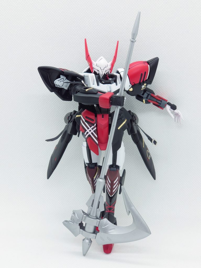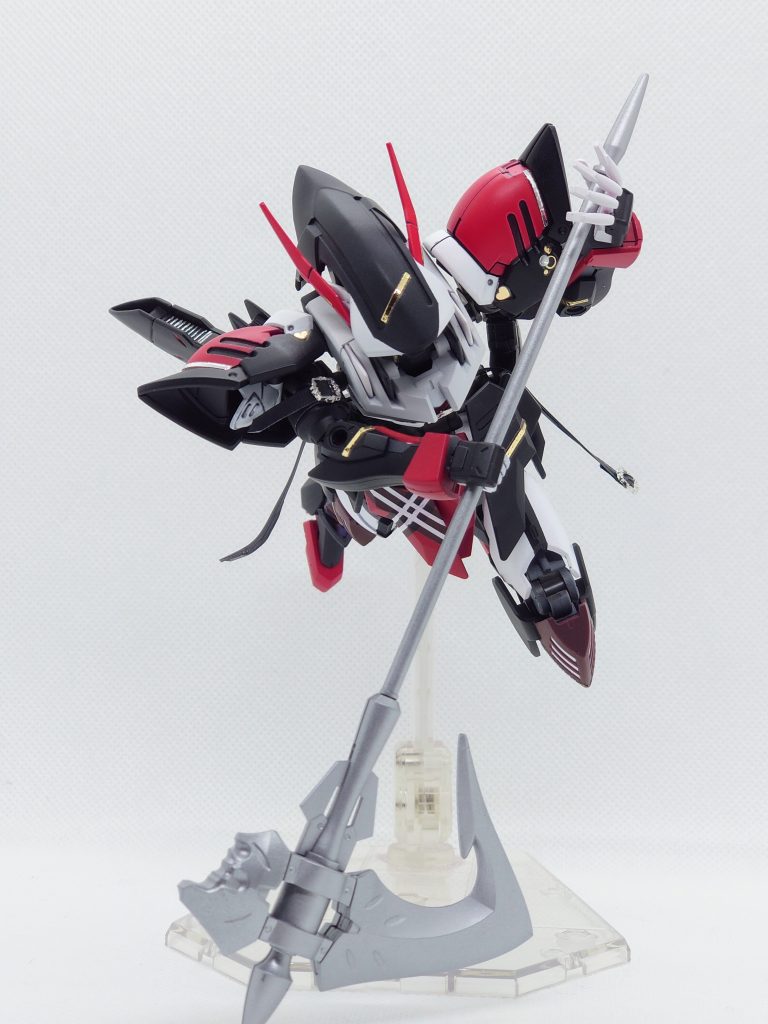 ガンダムグレモリーをベースにミキシングしました。腕はグリムゲルデ、脚はグリムゲルデ、ジークルーネを使用し、太もも、足首でそれぞれ2.5mm延長しスタイルを維持。足裏にプラ版を貼り厚底にしました。腕、胸には金具とベルトを装着しています。