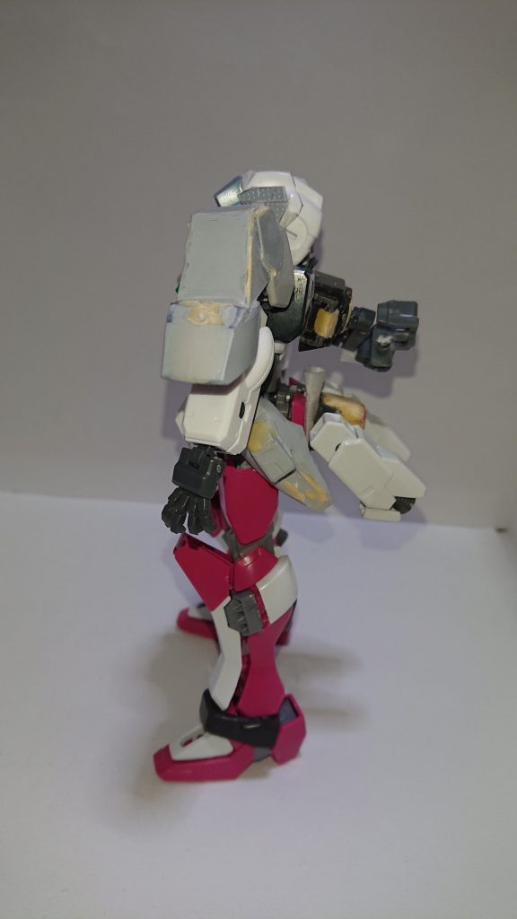 ・肩アーマーはケルディム・サーガのものを基礎にプラ板で箱組みして、先端は地味に旧キットのガンダムサンドロックのものをつないでいます。