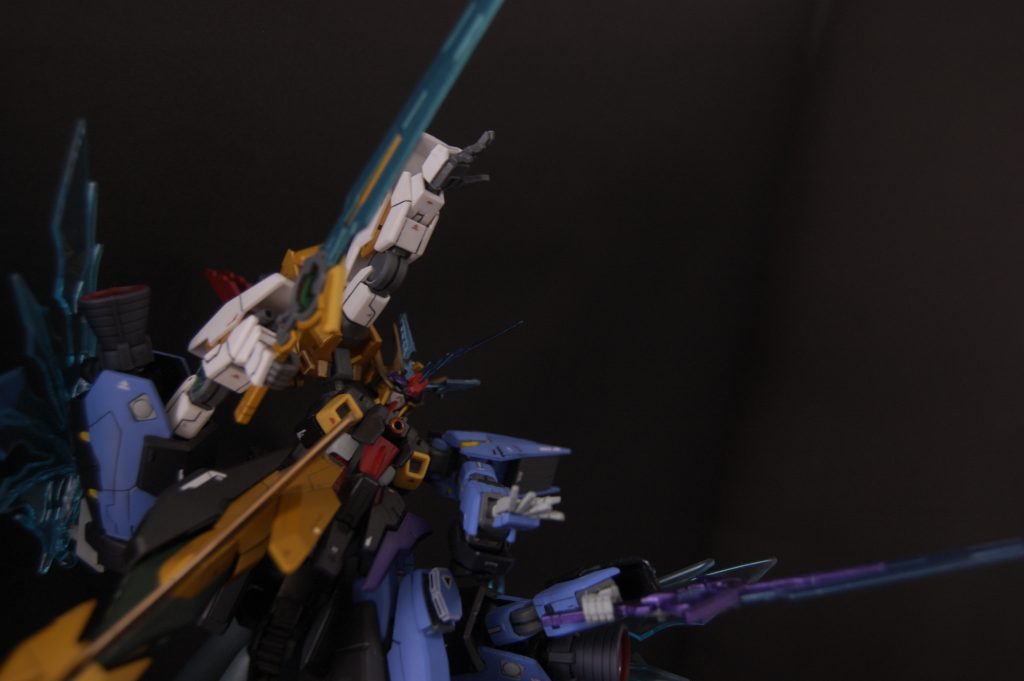 膝にブースターをつけてみたかったので、サーペントの足をブースターとしてつけ、最終決戦仕様の膝の形を意識して上にとがらせるためにテルティウムアームズの盾をつけてみました。バックパックはアスタロトのサイドアーマーにユーラヴェンのセンサービットをつけ、上からハイドラの丸っこい腿裏パーツをかぶせています。ライフルはアリオスのGNキャノンに色々付け足したもの、足はGP01Fbの肩にGNアーチャーのライフルをつけたものです。全体の雰囲気や配色はぬのむーさんのマスクコマンダーを参考にしました。