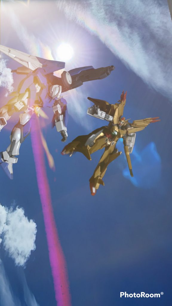 アリオスとハルートのプラモは共通の規格が多いので、組み換えるだけでなんちゃってファイナルフォーミュラーができました。追加でつくったパーツはレジン製の額と胸、ジャンクパーツを合わせたアンテナくらいです。左半身を紫にしたい気持ちもあったのですが、あくまでおまけ合体なので単体で似合うカラーリングを優先しました。