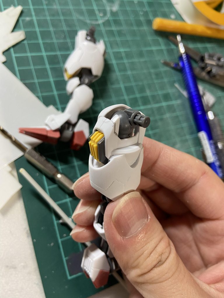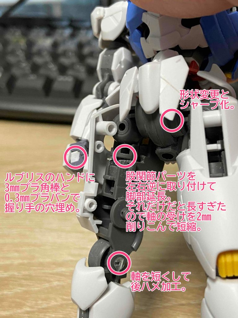 太もも裏は鉛筆の線に沿って切り欠き。向かって右が加工前、左が加工後。これでかなり股が広がります。足首が前後スイングしかできないHGエアリアルを綺麗に立たせるのにかなり効果的でオススメです。