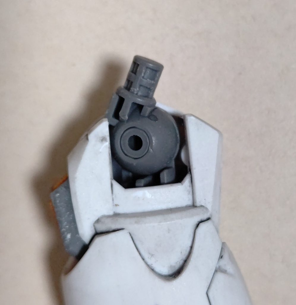別角度から。白いパーツにチタンシルバーのドライブラシが好きで多用しています。劇中の描写だと腕に固定するメリットなさそうですよね、このシールド。