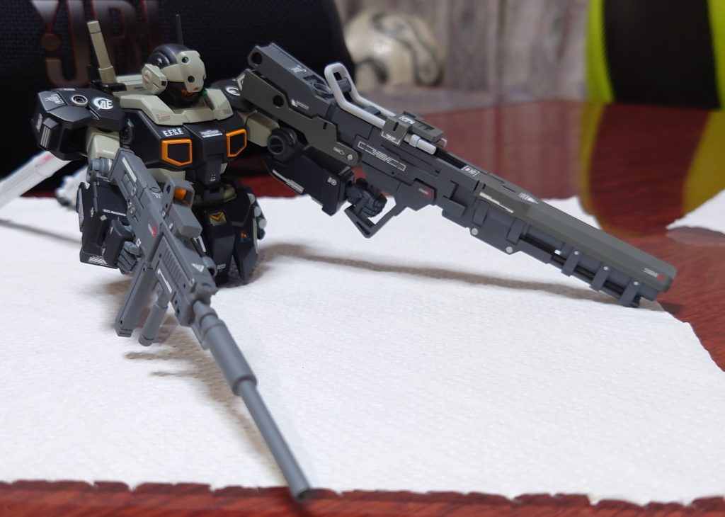 いいなぁ。ワンオフのカスタム感バリバリでカッコいいなぁ!切り込み隊長機って感じで、バズーカを威嚇でぶっ放し、バズーカ投げ捨てて、ライフルを撃ちまくって敵陣の中へ突っ込んで行く姿を想像できる。