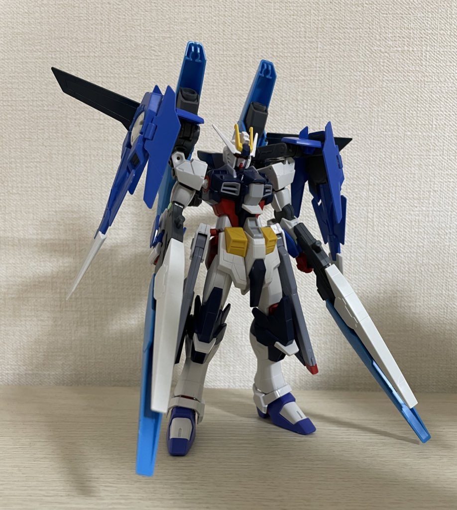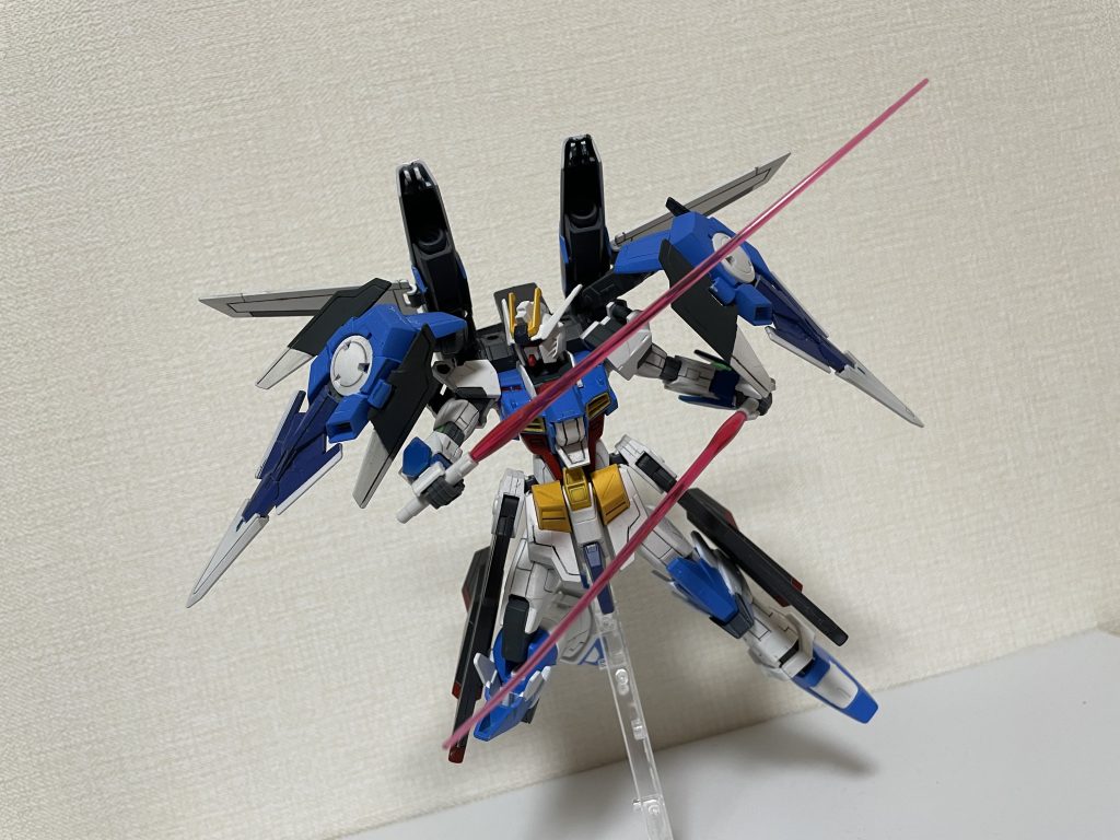 この時点で色は違和感はなかったので本体以外のバインダーなどは成形色ベースで塗装しました。エントリーのライフルはEGνガンダムの物を正体、ビルコスのパーツも組み合わせてあります。