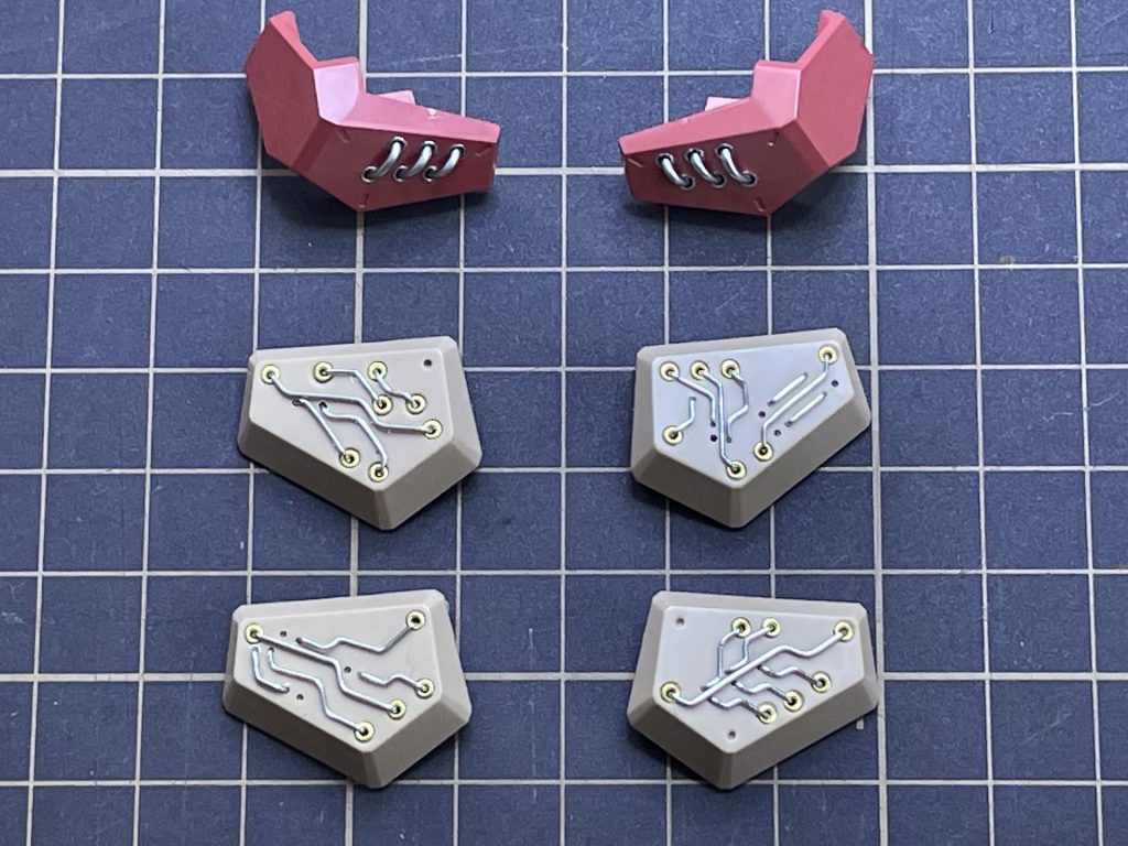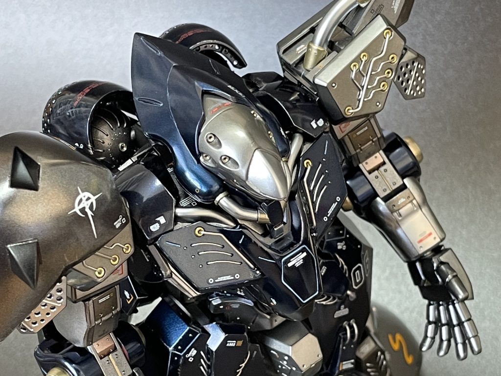 ワイヤディテールとメタルパーツ、シルバー仕上げでリアルな金属感を狙いました。パチ組みしてヘッドに手を入れたのが7月初旬、軽くワイヤー入れて成形色で上げる予定だったのですが、肩のアーマーにワイヤーを仮組みしたあたりからスイッチ入って、魂のワイヤーディテールと気合いのカスタマイズで、ようやく完成。
