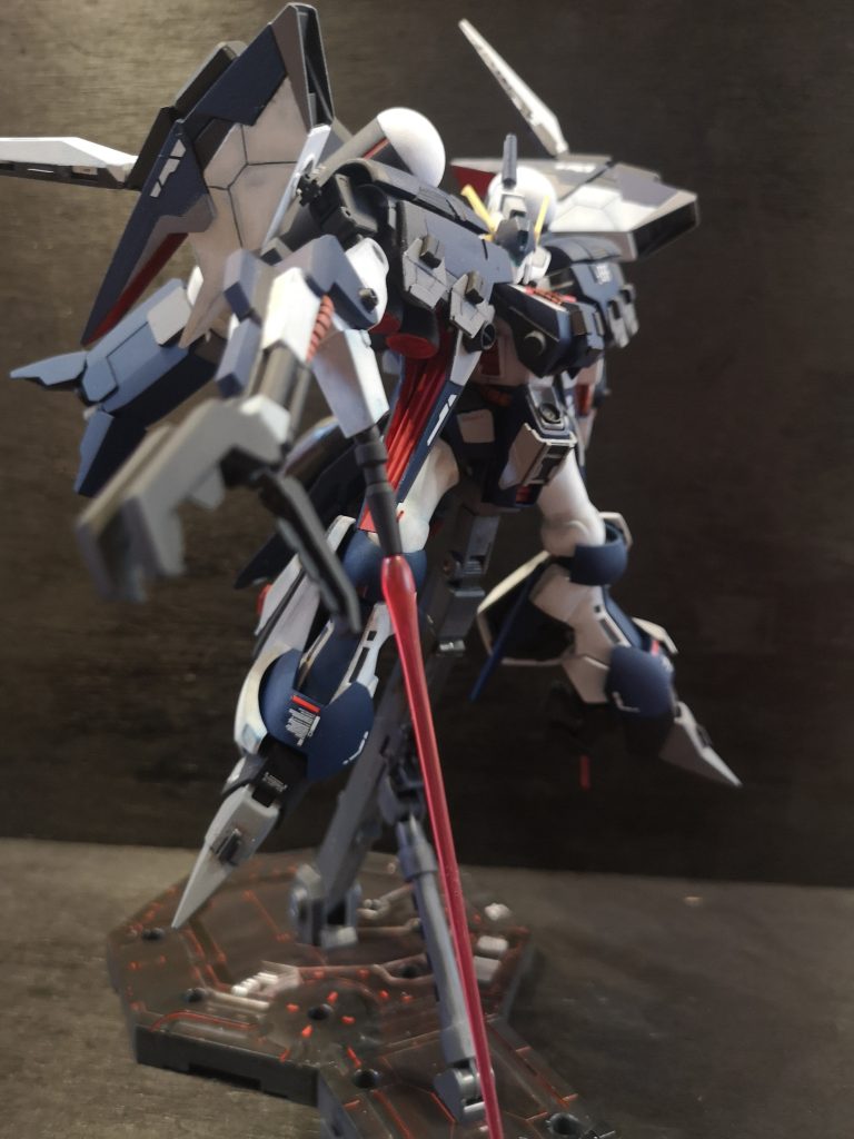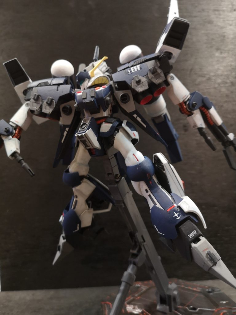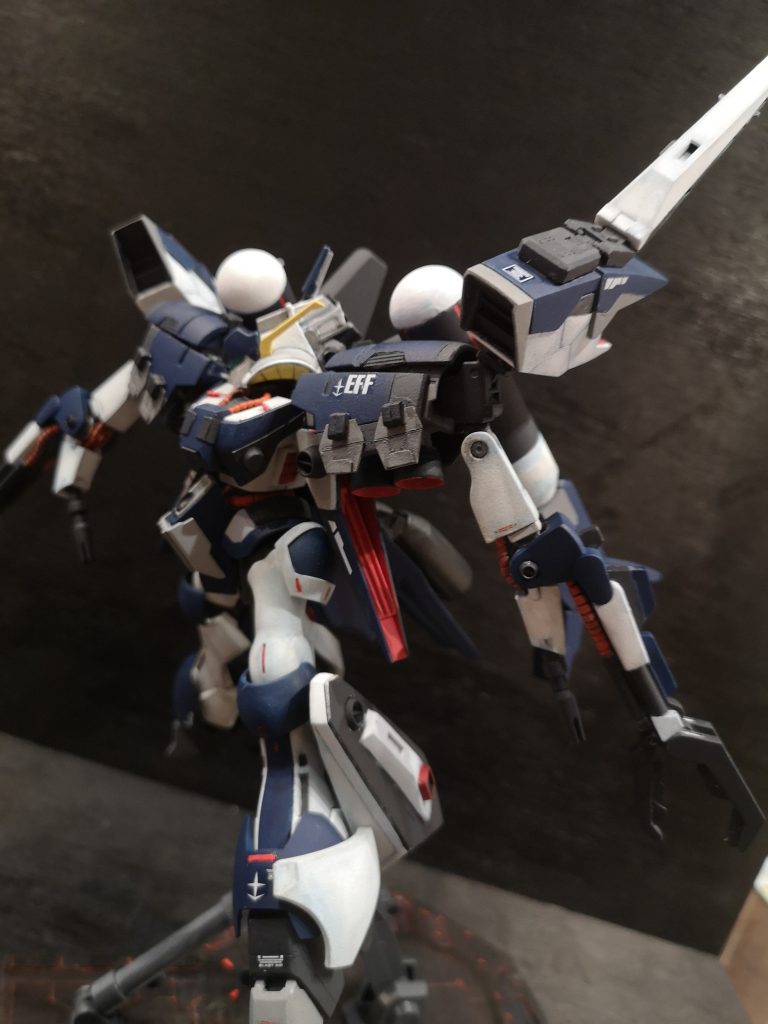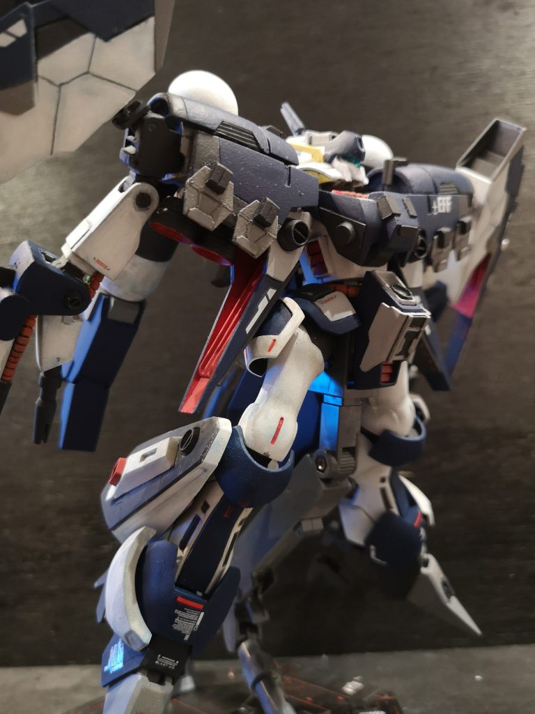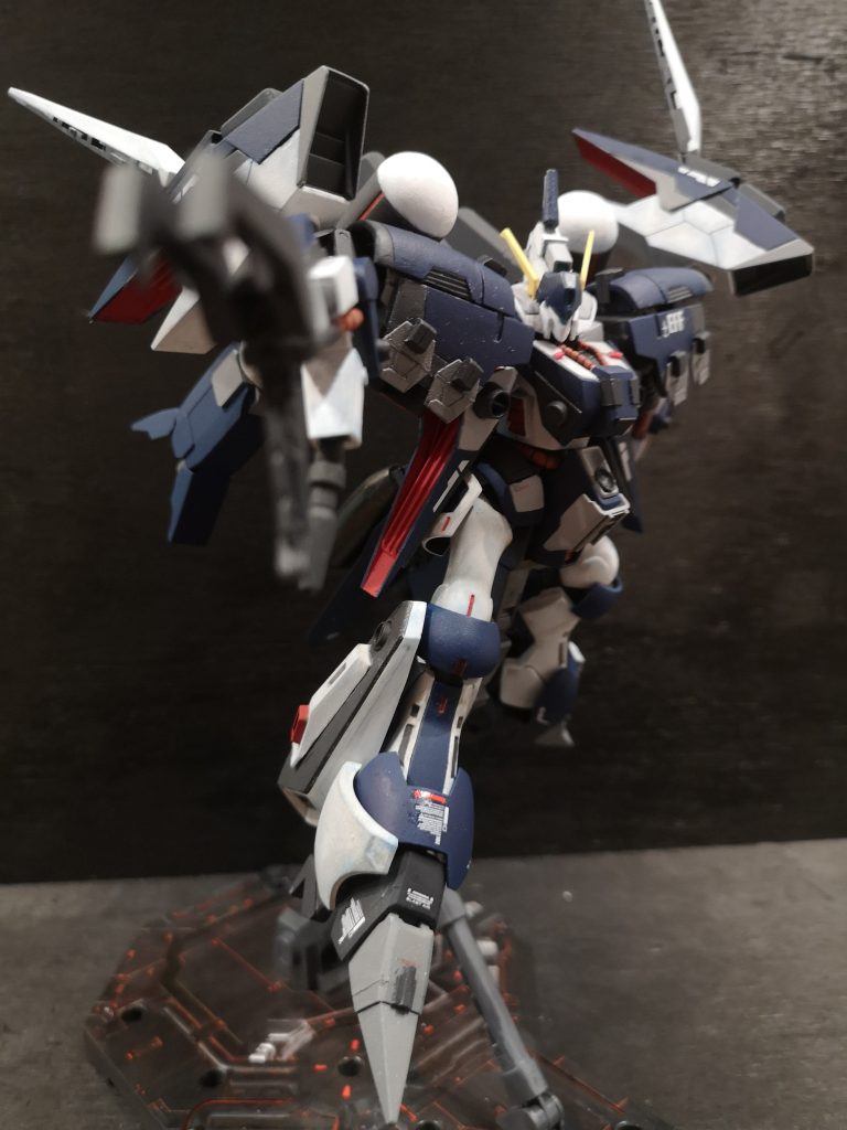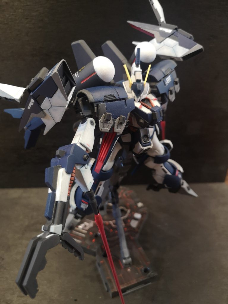 大きな改造は、ジャンクパーツでのディテールアップ、頭部の形状変更、脚部のパーツ追加、後部スラスターの新造を行いました。